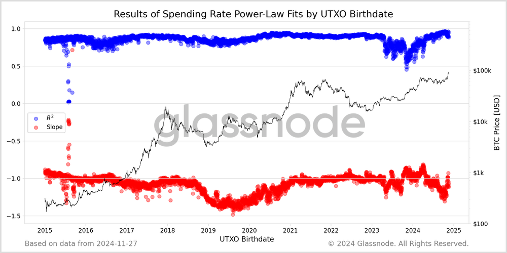 En general, la ley de potencias mantiene una notable consistencia a través de las diferentes fechas de nacimiento, lo que refuerza la robustez de esta dinámica en el tiempo. No obstante, ciertos periodos presentan una menor calidad de ajuste, aunque no hay una correlación aparente con los movimientos de precio durante esos momentos. Observamos un periodo prolongado en el 2019 en el que las probabilidades de gasto fueron más pronunciadas (valores de pendiente más pequeños). Una posible interpretación es que los inversores que compraron durante ese año, en medio de la caída del 80% desde el máximo histórico del 2017, lo hicieron con una visión de largo plazo, lo que llevó a una tasa de gasto más acusada de lo habitual.