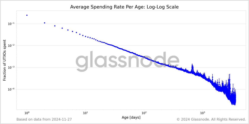 Esta disminución predecible en la probabilidad de gasto resalta un importante patrón de comportamiento: mientras que las monedas más jóvenes tienden a ser activamente intercambiadas o utilizadas para especular, las monedas más antiguas se vuelven progresivamente más inactivas con el tiempo. Adoptando esta perspectiva continua, tanto analistas como inversores pueden obtener una comprensión más profunda de la reducción progresiva de la actividad de gasto a medida que las monedas envejecen, lo que enriquece la interpretación de los datos del blockchain y el comportamiento de los inversores.