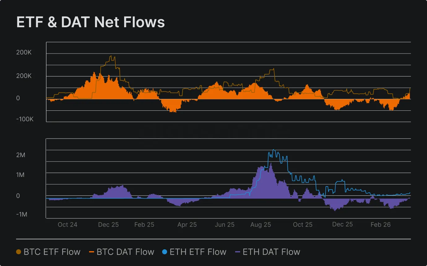 - After sustained February outflows, BTC ETF and DAT flows returned to positive, while ETH institutional flows showed early signs of stabilization.