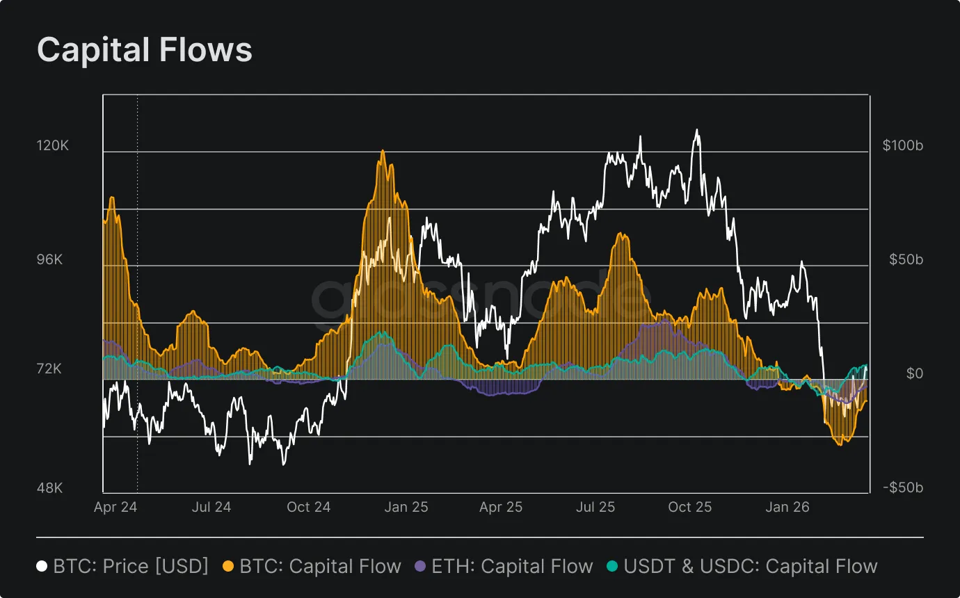 Bitcoin and Ethereum continued to experience sustained net outflows, with BTC and ETH capital flows registering -$9.6B and -$3.2B. However, stablecoins broke from the broader negative trend, flipping to +$6.2B in net inflows. Rather than signaling a broad return of risk appetite, this rotation likely reflects a defensive repositioning, with capital migrating into dollar-denominated on-chain instruments while conviction in spot crypto assets remains under pressure heading into mid-Q1 2026.