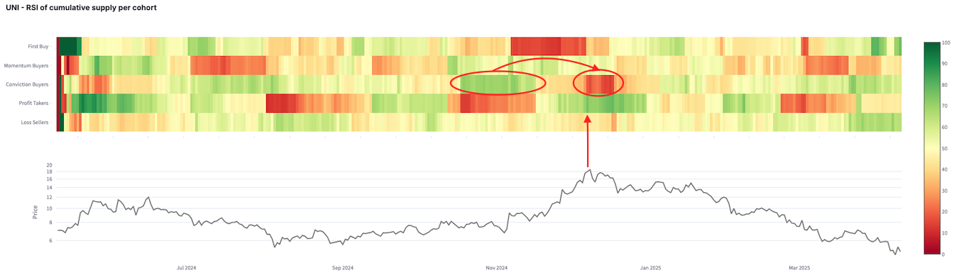 Looking at UNI in late 2024, we see that Conviction Buyers (third row from the top) were actively accumulating early in the uptrend – shown by deep green colors. This indicates strong belief-driven buying, typically a healthy sign during price appreciation.