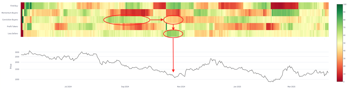 This behavioral pivot – from conviction to capitulation – is a hallmark of market exhaustion. When even the most resilient holders start selling, it often marks a local bottom. In this case, the simultaneous drop in conviction and surge in loss selling served as a powerful contrarian signal, presenting tactical entry opportunities for traders willing to go against the crowd.