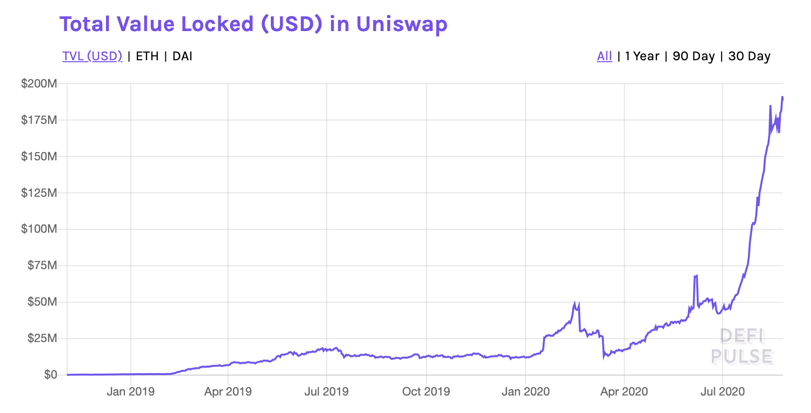 After growing slowly but steadily for the first year of its existence, Uniswap started seeing much more rapid growth in 2020. Then, in July, its growth rate took off, taking total capital locked up in Uniswap from $50 million to over $150 million by mid-August.
