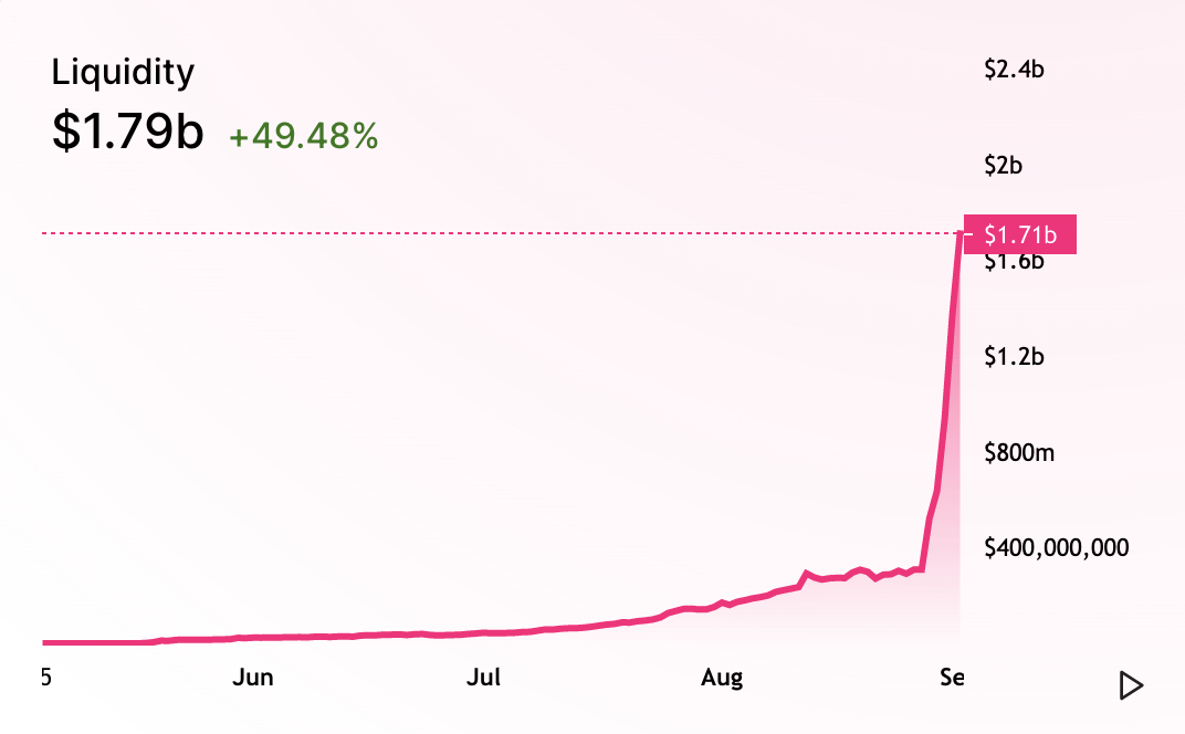 Since the SushiSwap liquidity mining phase launched, total liquidity on Uniswap has skyrocketed from $300 million to $1.8 billion, and is still climbing as opportunists scramble to accrue LP tokens and stake them on SushiSwap.