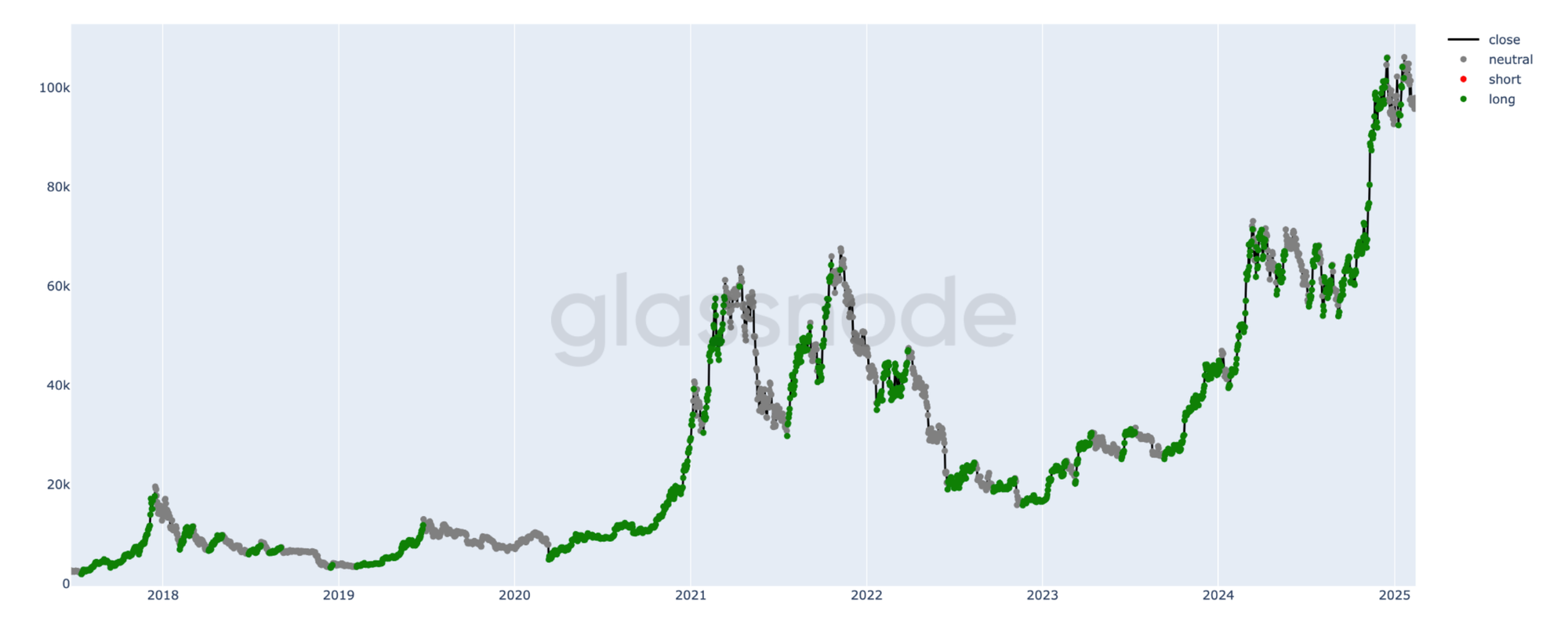 Figure 1: Hierarchical trend segmentation applied to Bitcoin. Green indicates uptrending periods (Label 1), gray shows downtrending/sideways markets (Label 0).