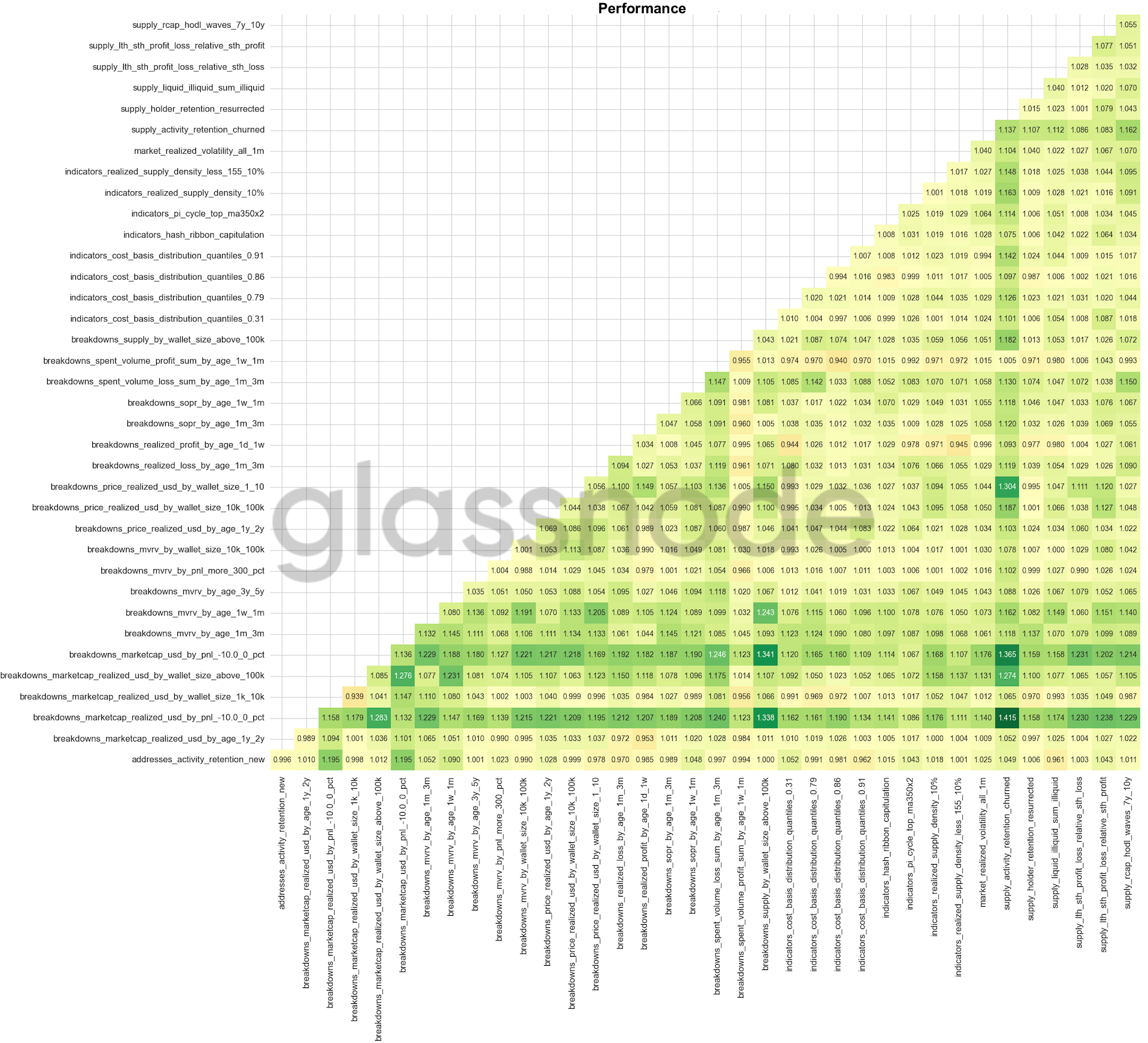 Results for this first phase are shown in Fig. 2. For example, the metric "MVRV by Age: 1 month to 3 months" in combination with a context window of 64-95 days resulted in an average performance of 1.152 relative to a simple Buy-and-Hold strategy. Note though, that these findings constitute only the first step in our process and by themselves are most likely not related to any robust trading signals.