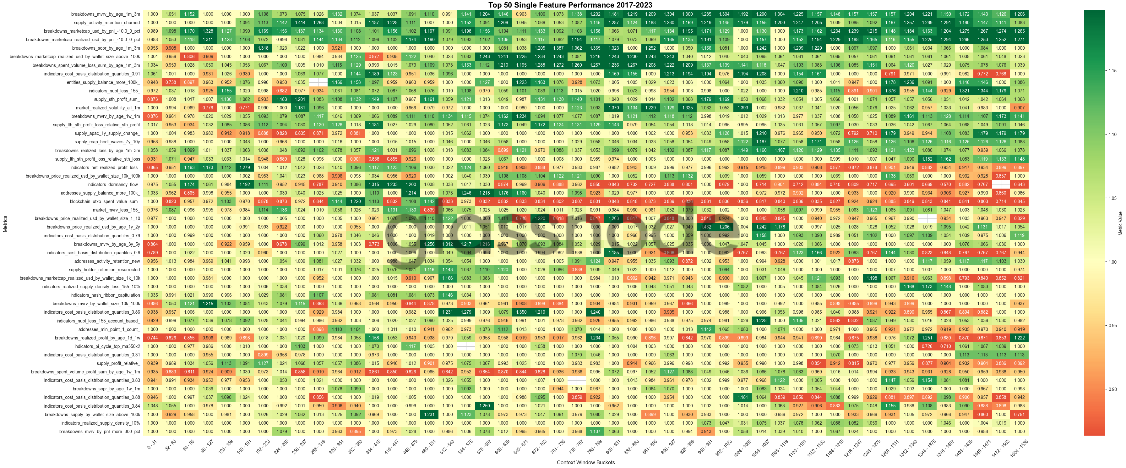 Figure 2: Performance heatmap of top 50 single features. Rows show metrics, columns represent context window buckets (0-1,535 days). Color intensity indicates median annual performance for 2017-2023.