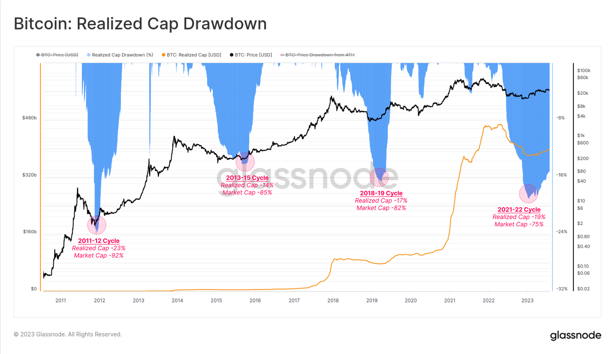 The drawdown experienced by the Realized Cap tends to be significantly smaller than that of the Market cap, ranging between -23% and -14% to date. This compares to the 92% to 75% drawdowns in spot prices.