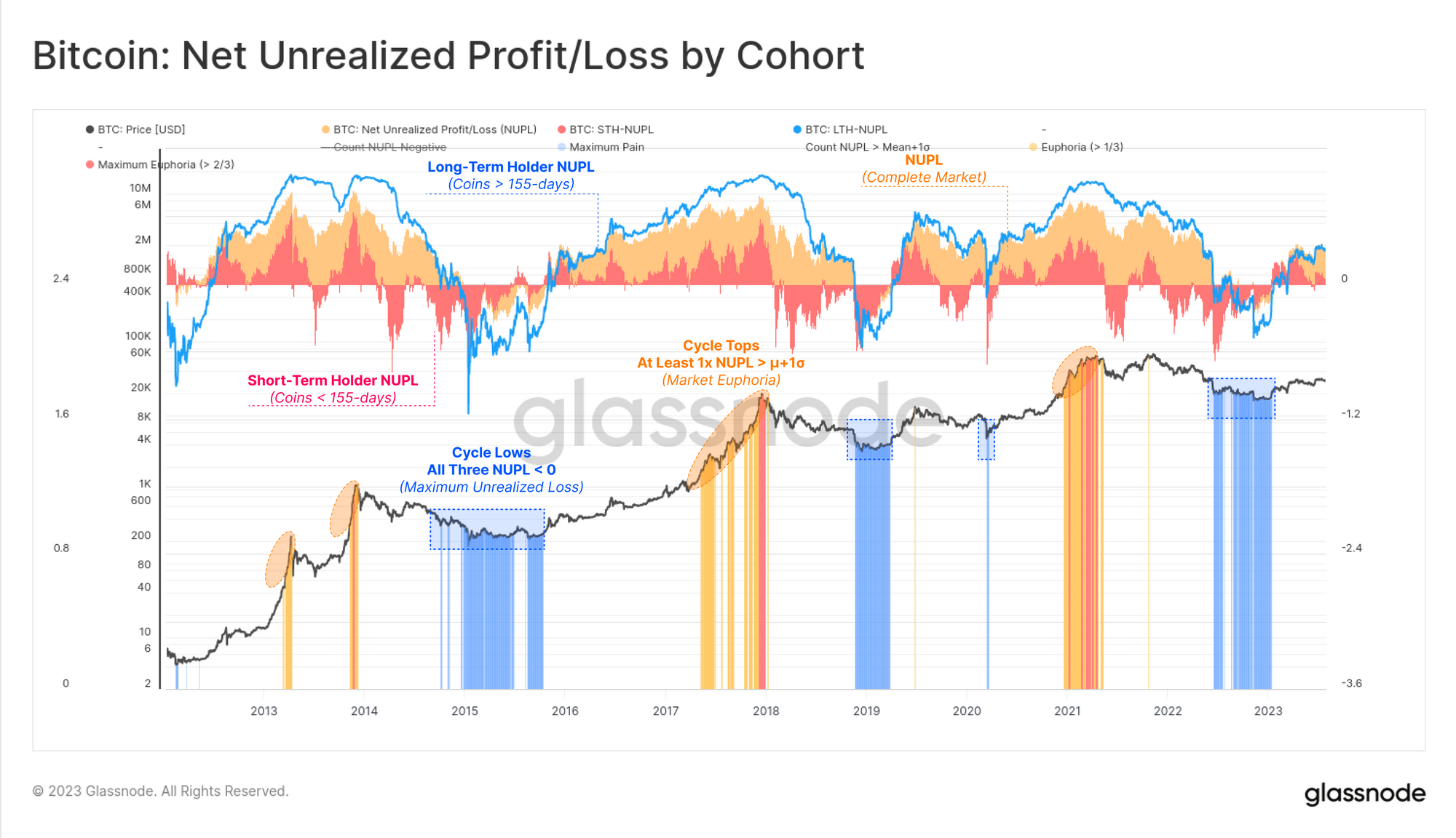 One of the most popular on-chain tools is the Net Unrealized Profit/Loss (NUPL) metric which presents the unrealized profit/loss held in the supply as a proportion of the Market Cap. Here we have presented variants of NUPL for three cohorts: