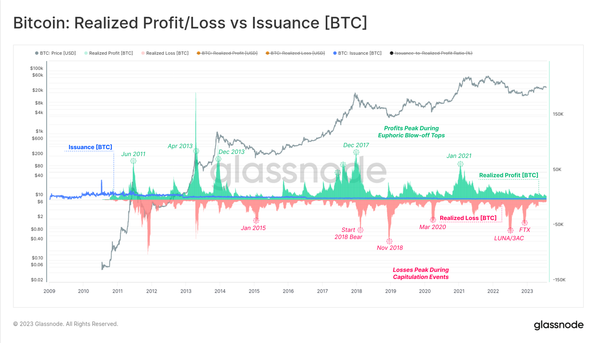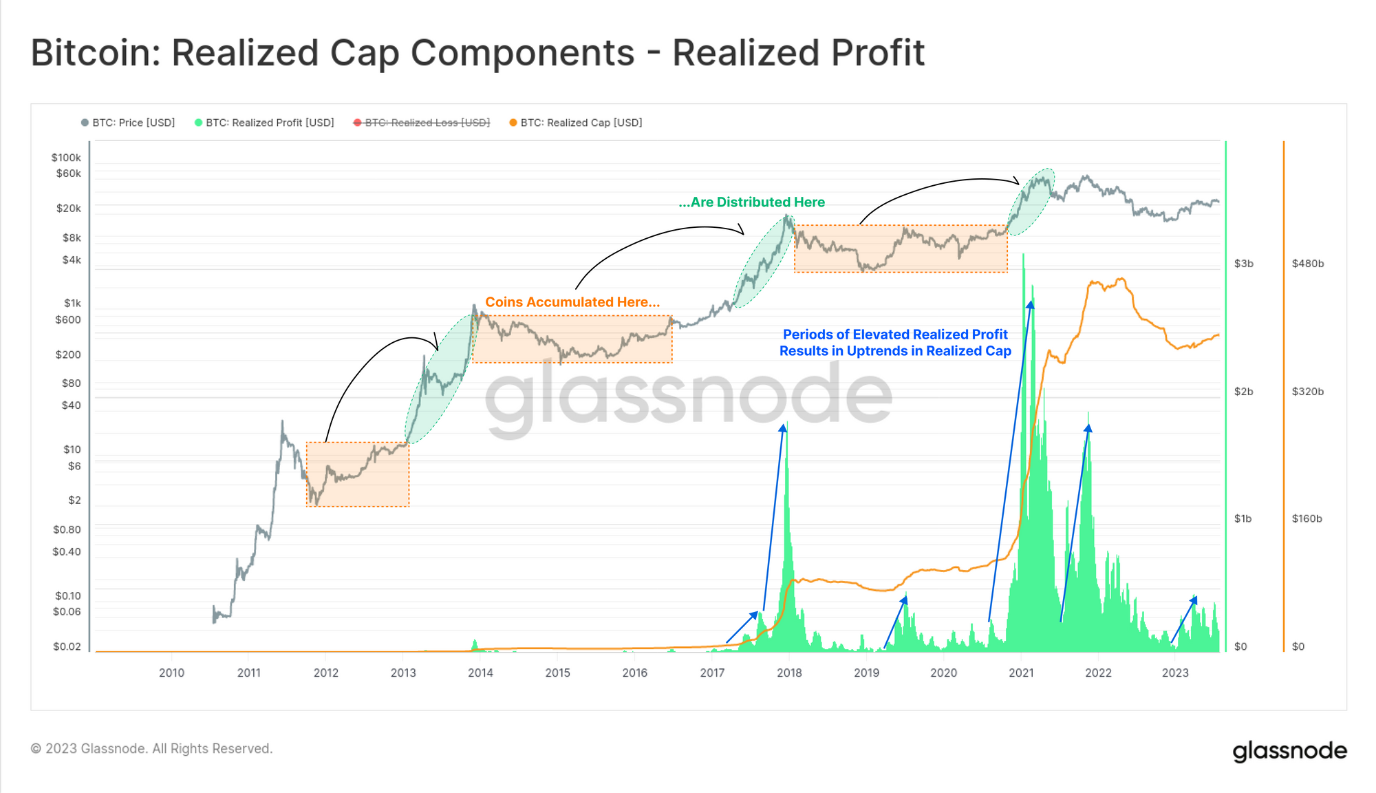 - Realized Profits dominate during macro uptrends, and frequently peak around local and global market highs. This describes the mechanic of profit taking which eventually over-saturates incoming demand (via a correction, or macro scale trend shifts).