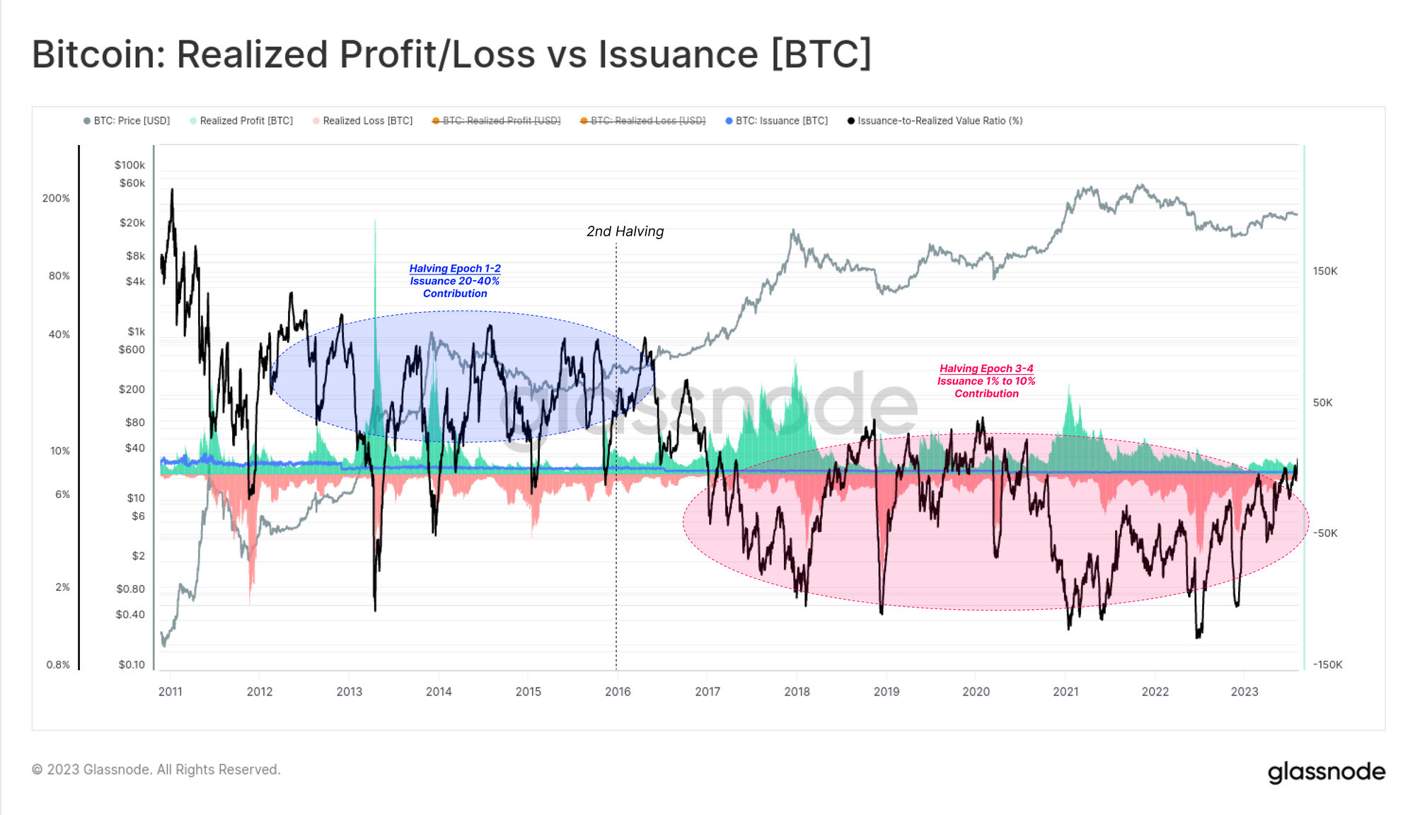 In modern times, the Thermocap accounts for just 8.7% of the total value stored within the Realized Cap. The chart below shows that up until the second halving (in 2016), issuance (blue) accounted for around 20% to 40% of the value entering/exiting Bitcoin on a daily basis.