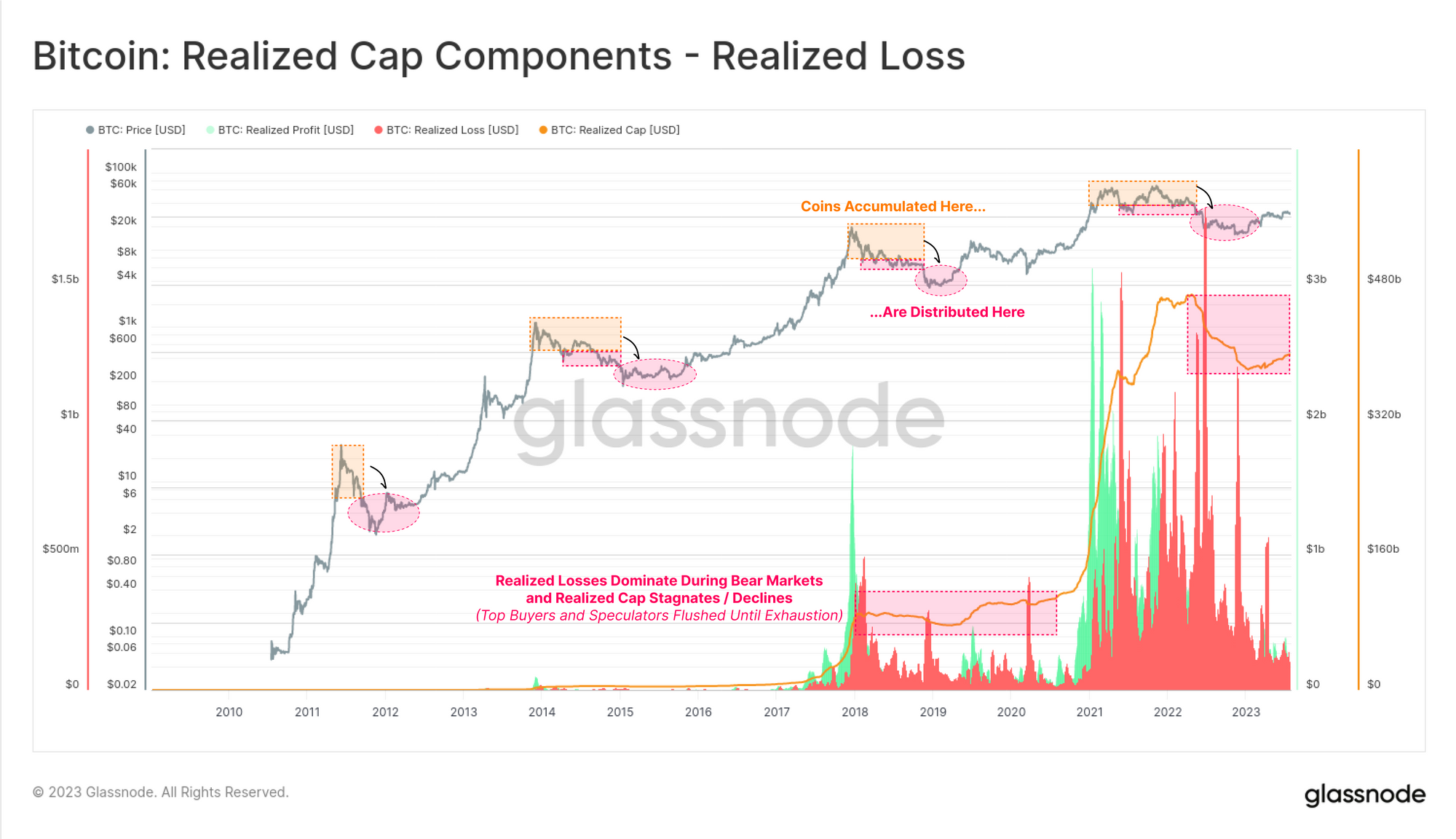 The Realized Cap often plateaus or gradually declines throughout bear markets. The chart below shows how elevated realized loss levels tend to be sustained over longer periods of time, as the market digests and consolidates the bear market. As the attention of speculators and new investors dwindles, the higher conviction and price insensitive HODLer cohort begin to diligently work towards establishing a market floor.