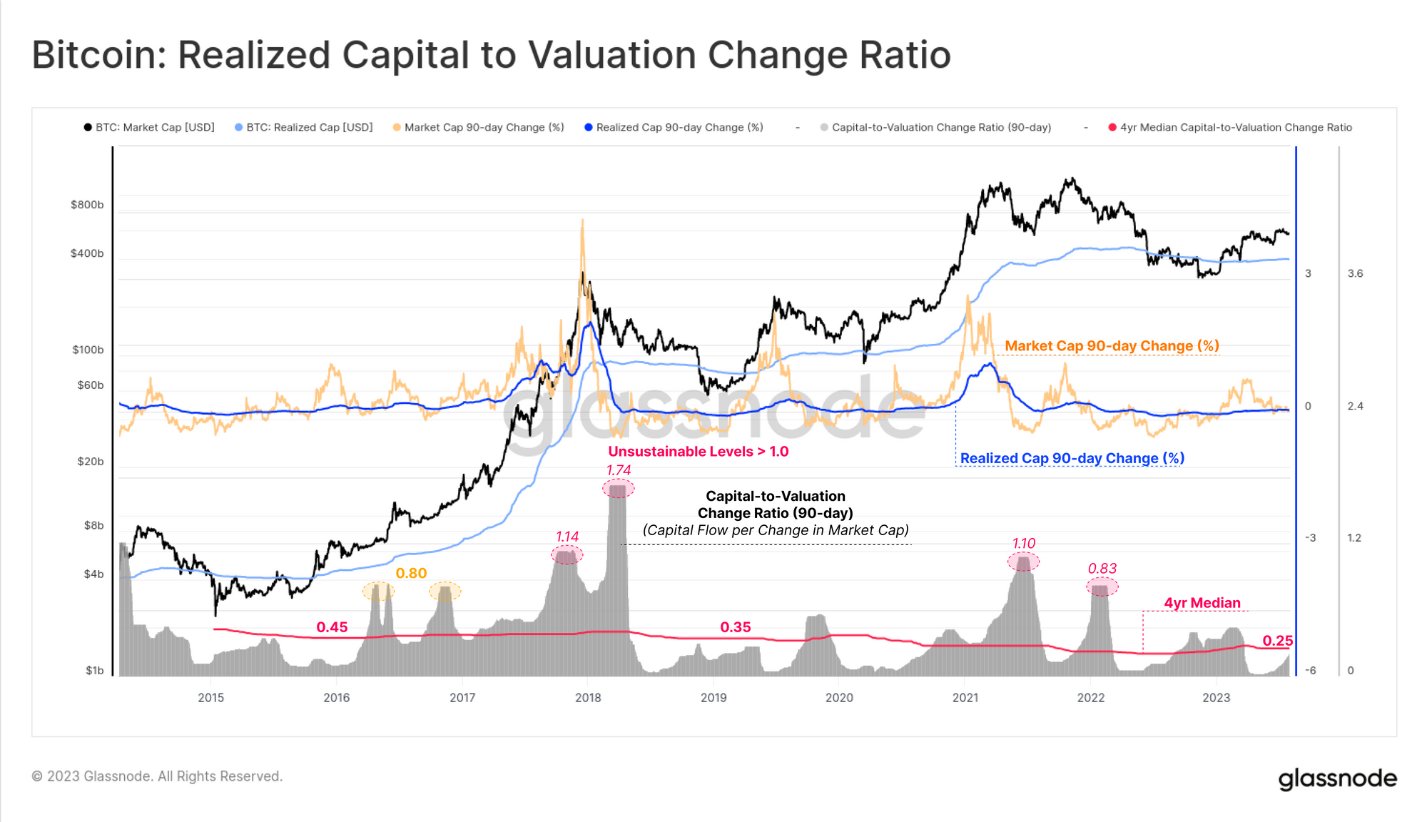 - Calculate the quarterly percent change in both the Market Cap and the Realized Cap (absolute value) and take a ratio (Rcap Change / MCap Change).