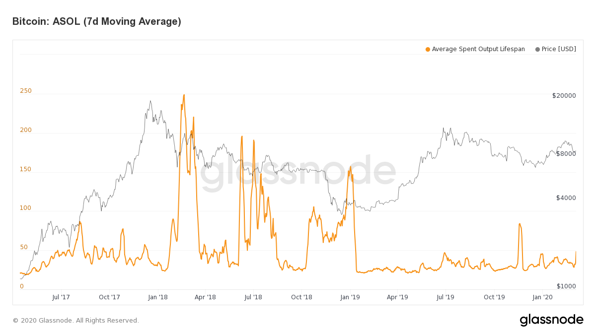 ASOL (Average Spent Output Lifespan) represents long-term investor confidence by showing when long-term HODLers are exiting the market. Historically, increases in this metric have come simultaneously to big sell-offs as long-term investors sell their positions.