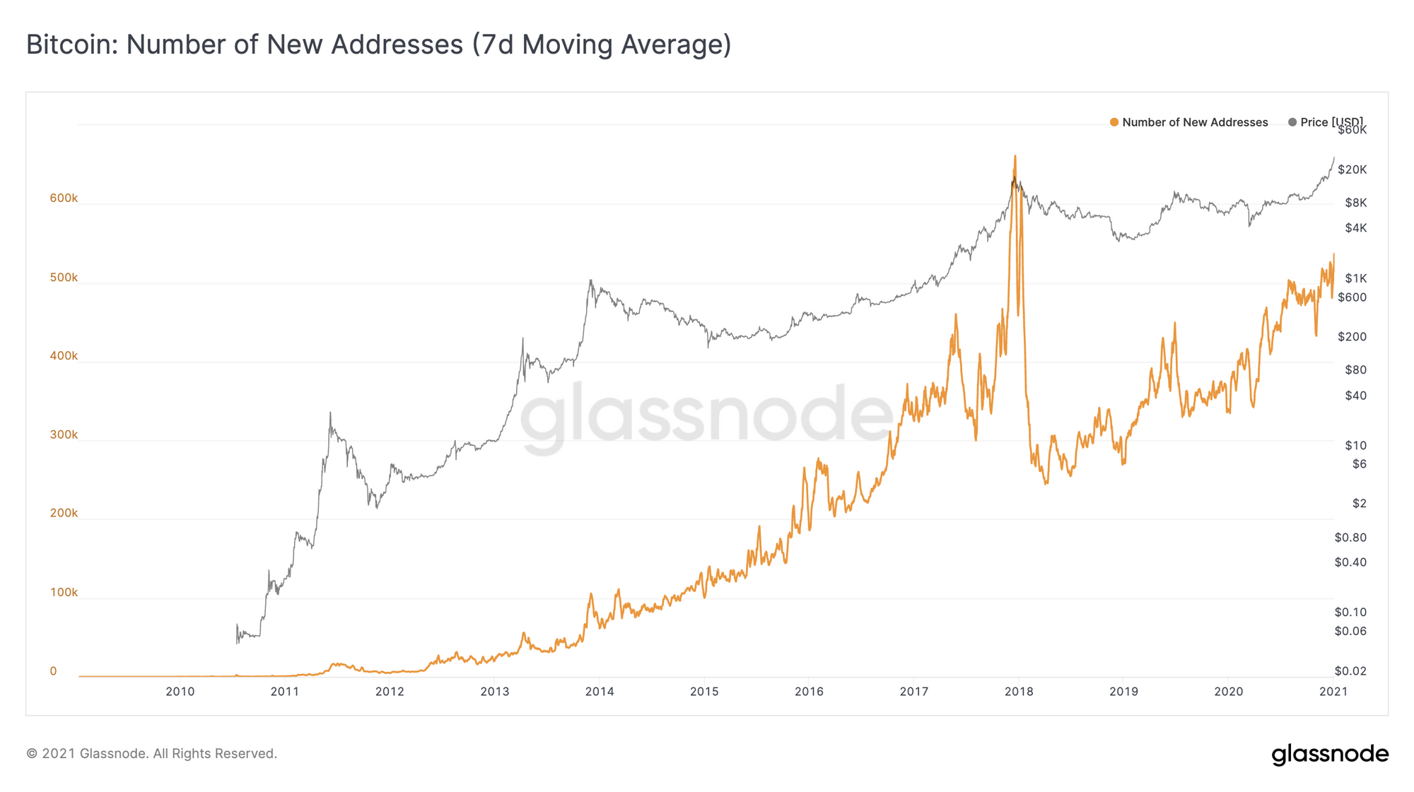 However, while news coverage and retail interest in bitcoin are rapidly growing, the number of daily new BTC addresses has still not reached 2017 levels. This metric's steady and consistent growth (as opposed to the sudden peak seen in the last major bull market) suggests that BTC is experiencing strong organic growth in adoption, but not the sort of viral growth typical of a bubble.