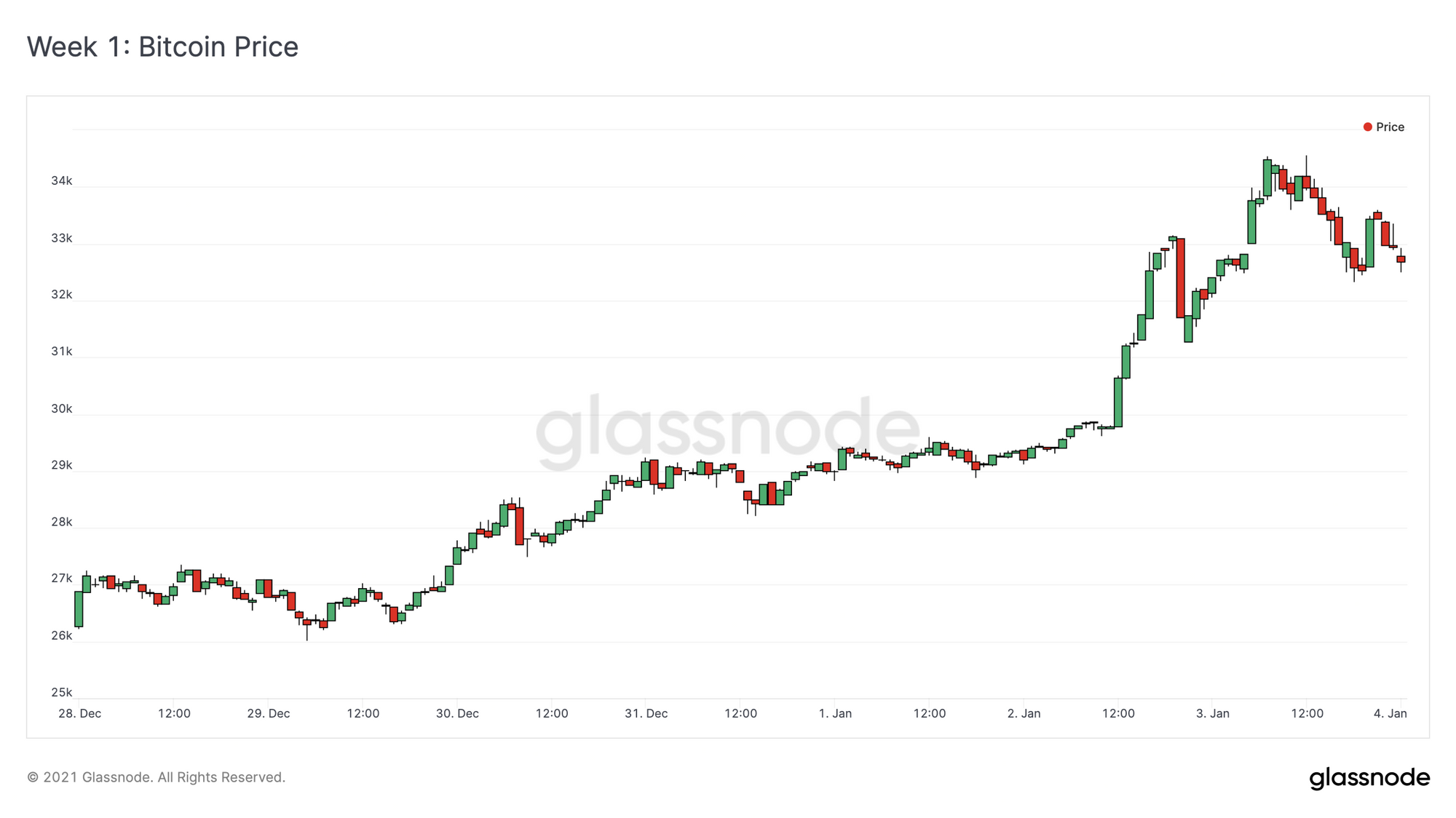 Bitcoin had yet another impressive week over the New Year period, reaching new all-time highs and exceeding $30k for the first time. After starting the week at $26,270, it increased continually, reaching a high of $34,550 before dipping slightly to end the week at $32,685.