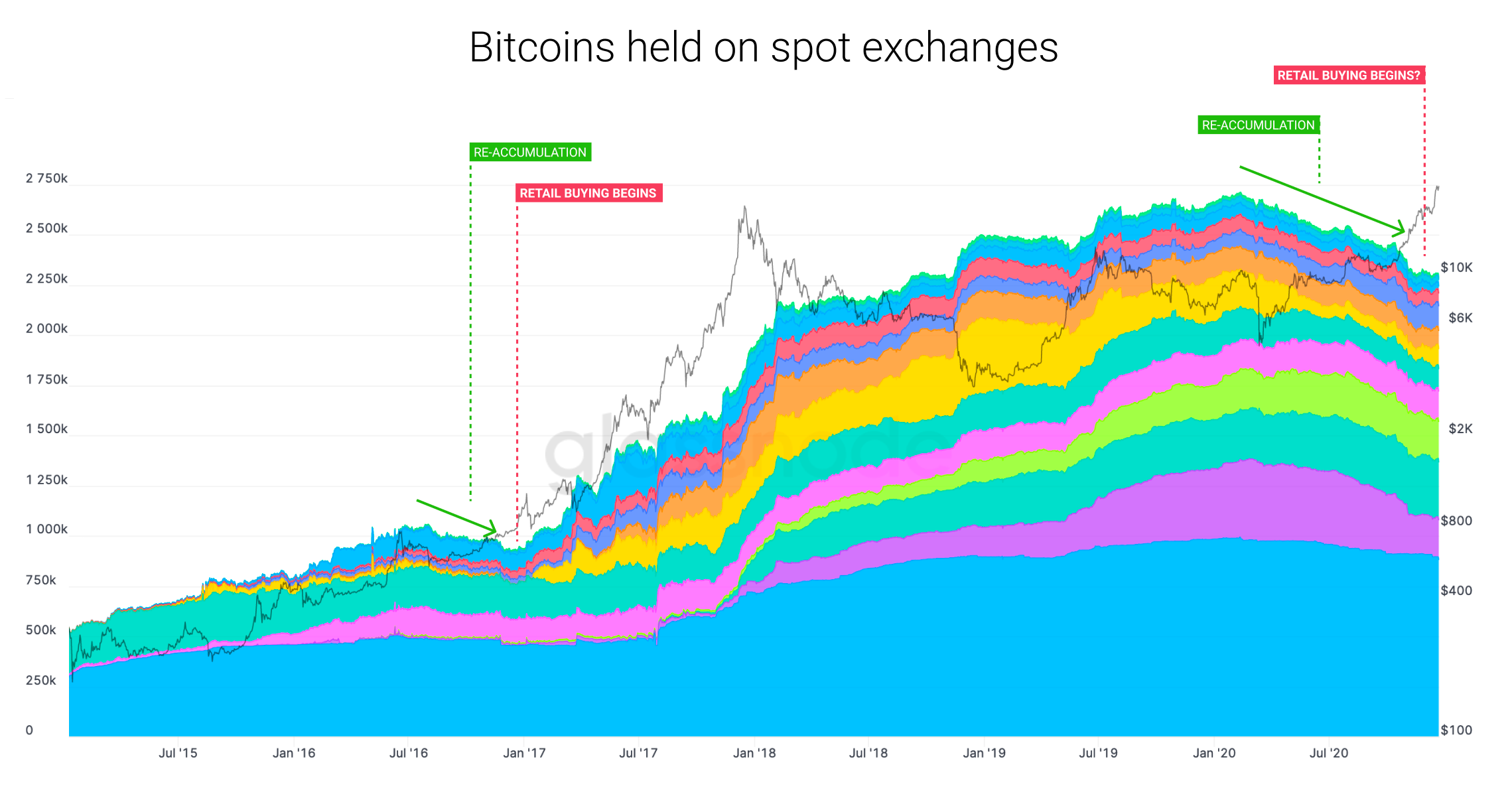 What causes inventory to increase in later stages of the bull market? Retail tends to store their coins on exchanges which attributes to a net inventory climb. This typifies the main phase of the bull market. Since we already know institutions are buying in large quantities, the flattening of spot inventory depletion is a sign that retail buyers are now entering in large volumes, attracted by recent price rises.