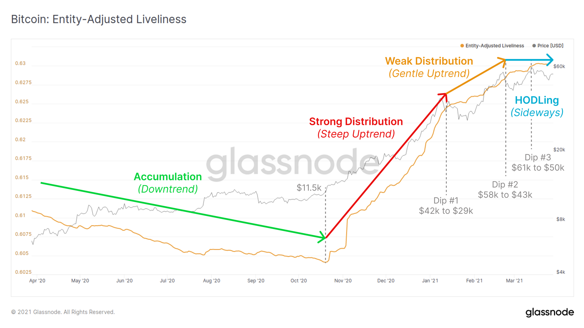 - Sideways (blue): Balanced accumulation and destruction suggesting HODLing is increasing, especially relative to the preceding uptrend.