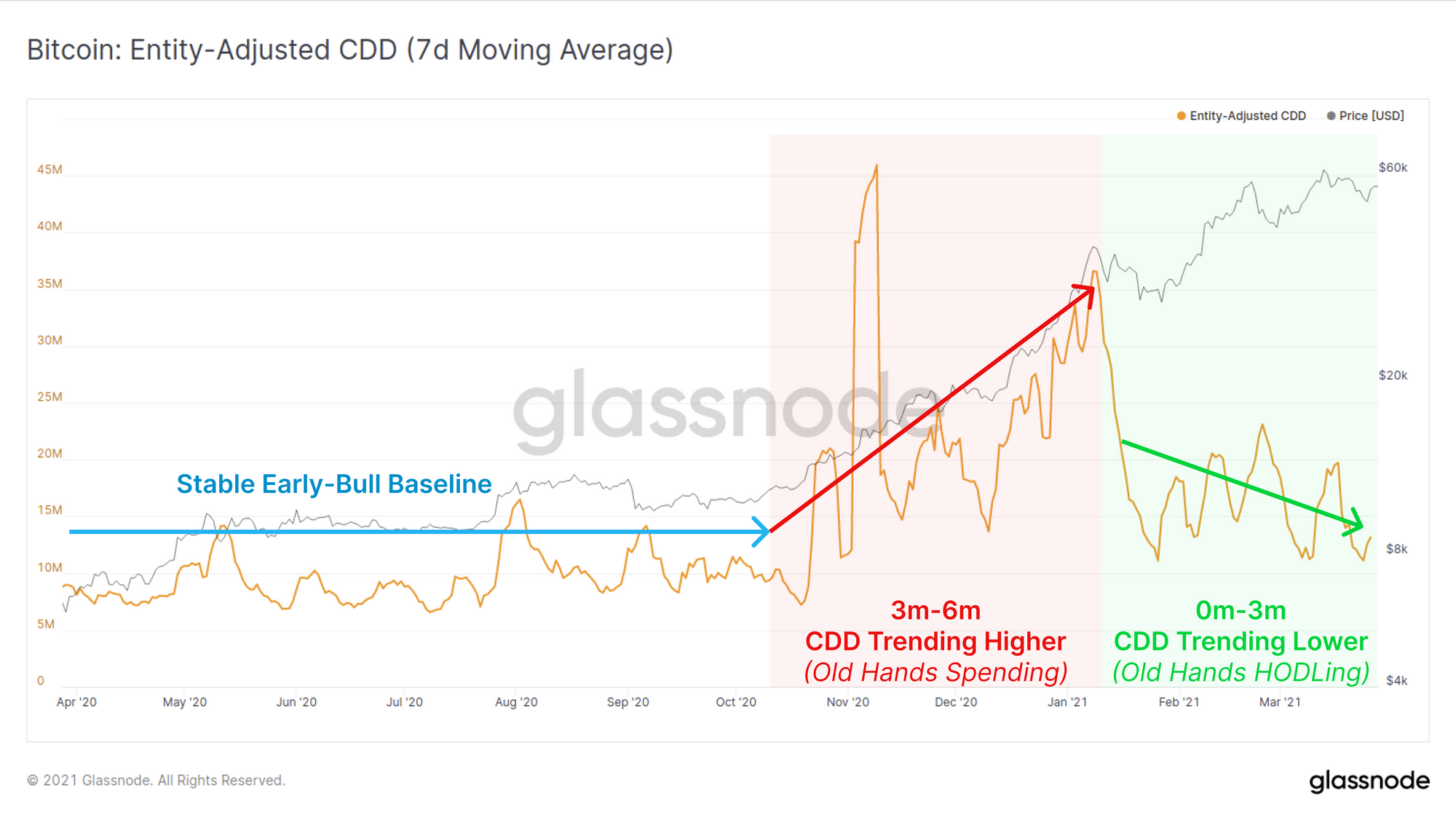 The CDD metric indicates that over the last three months, Old Hands have slowed their spending significantly. This week in particular, CDD has returned to levels similar to the early 2020 bull market baseline signalling HODLing is the preferred behaviour for old coins.