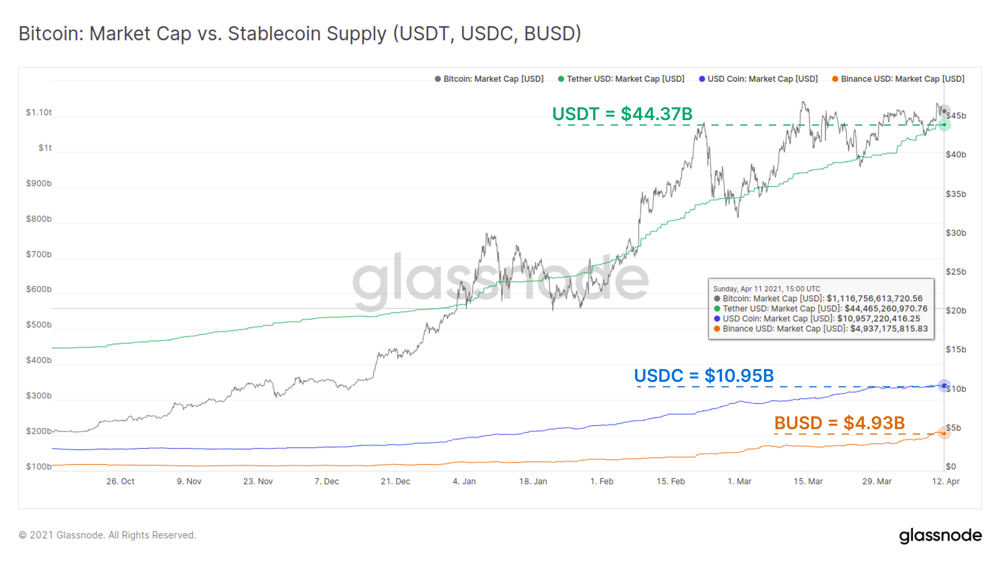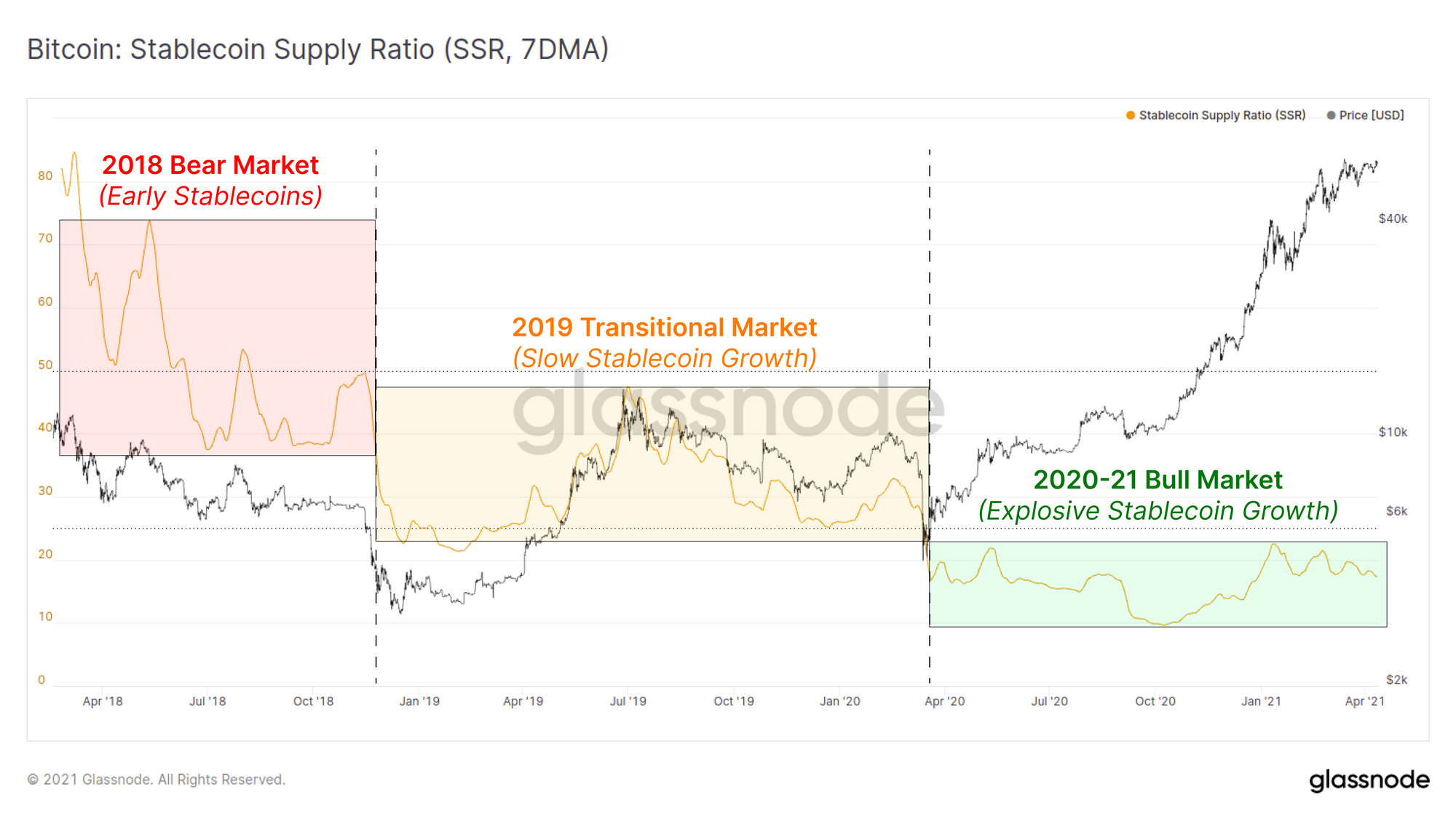 The growth of stablecoin supplies throughout 2020-21 has held the SSR metric near historical lows suggesting a relatively high buying power of digitally native dollars. The demand for digital dollars appears to be keeping pace with demand for Bitcoin and cryptocurrencies as a whole.