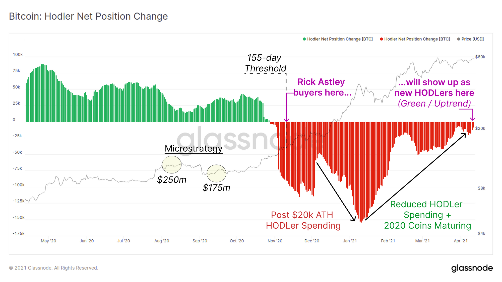 155-days ago was around mid November 2020, and BTC prices were trading up from $16k to $18k. This followed Microstrategy's initial two BTC acquisitions ($250m in Aug and $175m in Sept) and was around the time Coinbase exchange balances began to deplete (see our Week 13 Newsletter). This suggested that real institutional demand had arrived.
