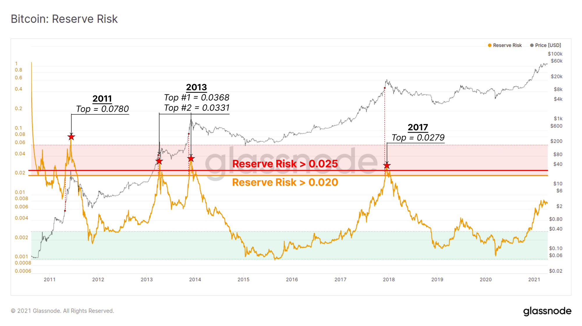 Market tops have historically occurred at Reserve Risk values > 0.02 but often extend well beyond that with both 2013 reaching 65% higher for example.