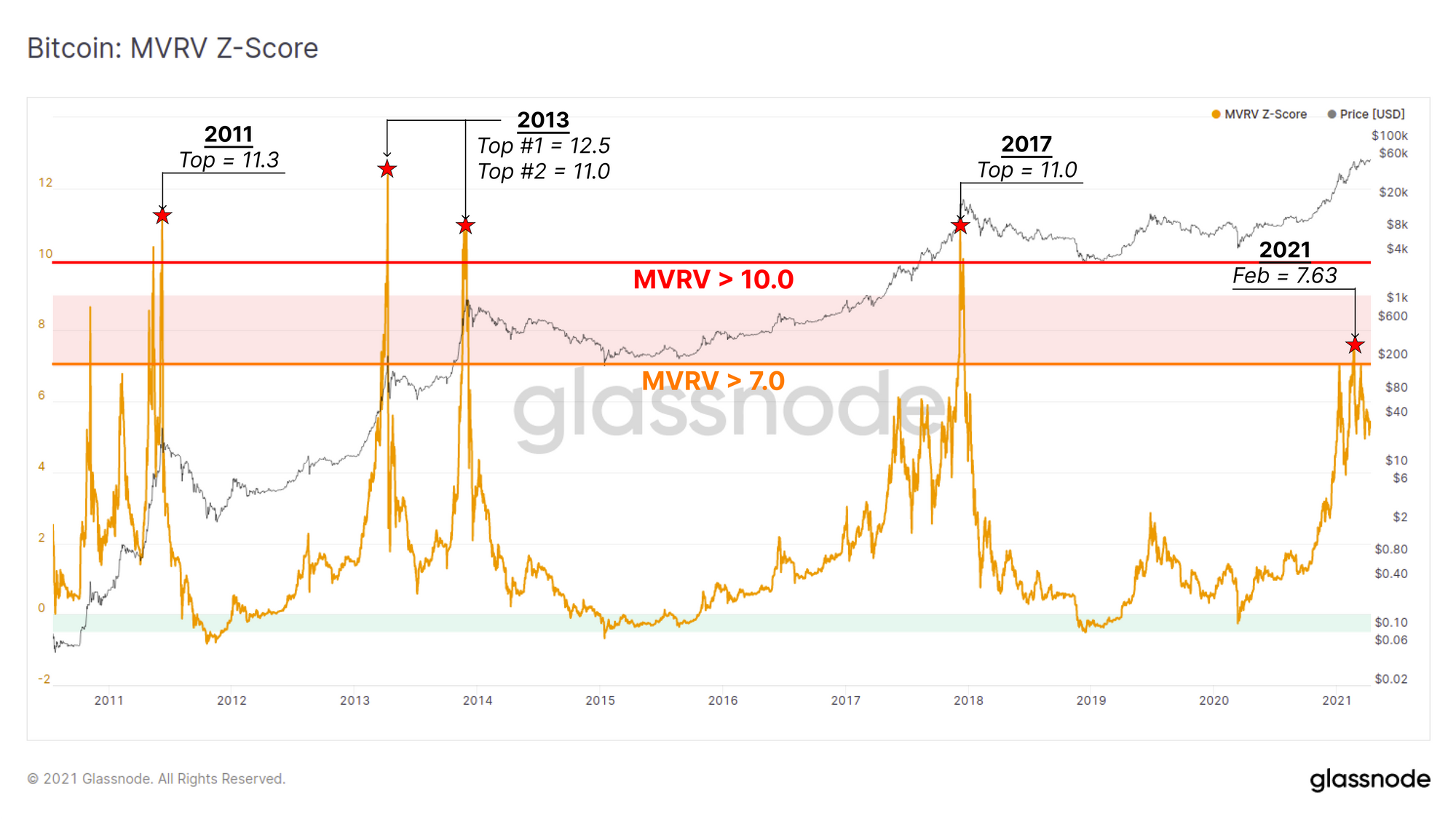 Market tops have historically occurred at MVRV Z-Score values > 7.0 however have consistently reached values greater than 11.0 in all previous cycles.