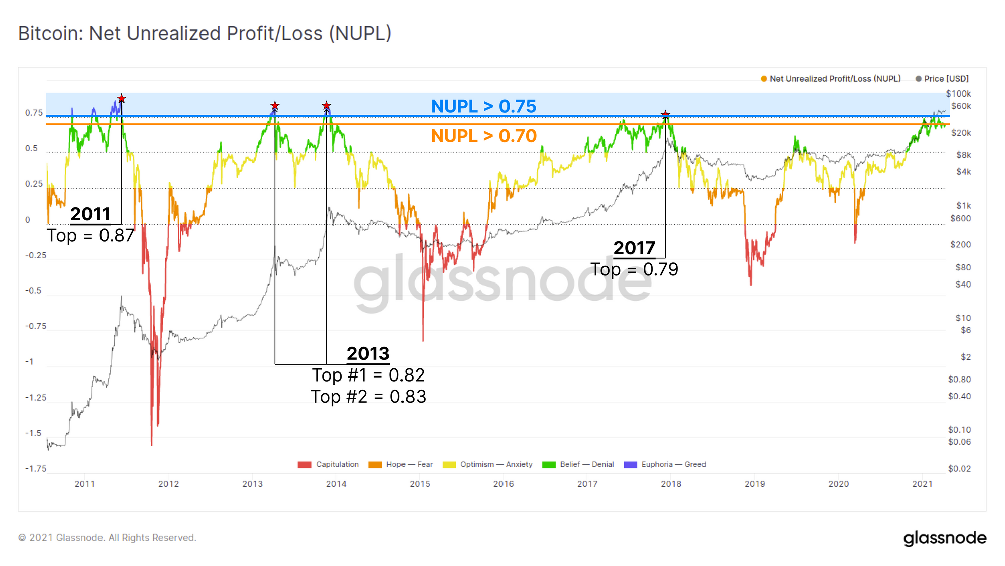 Market tops have historically occurred at NUPL values > 0.75 suggesting aggregate unrealised profit in the system is greater 75% of the market cap.