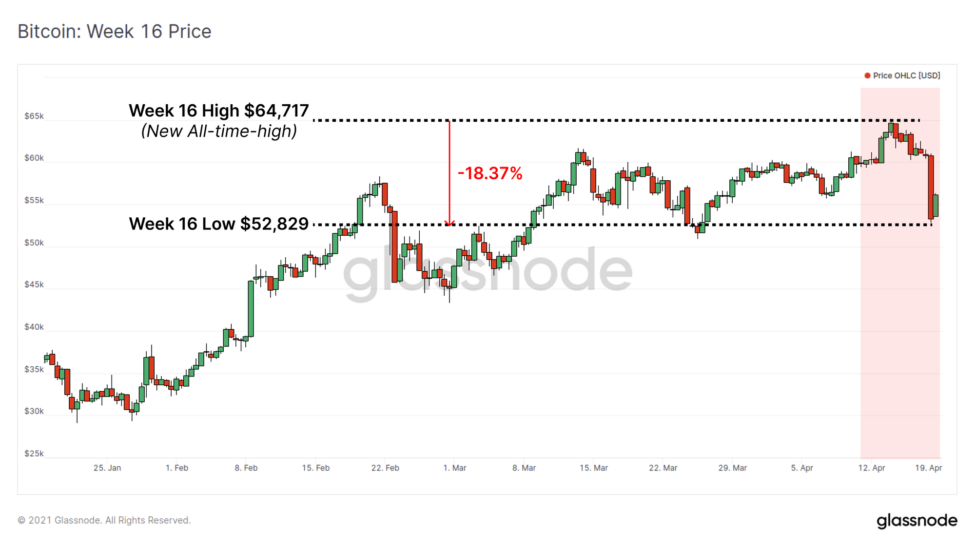 The Bitcoin market ran into significant volatility this week, especially in comparison to the relatively calm consolidation in play since late February. This week, BTC price hit a new all-time-high of $64,717 in the lead-up to the much anticipated Coinbase direct listing. However this was short lived and was followed by a sell-off on Sunday with BTC trading down by more than -18% to a low of $52,829.