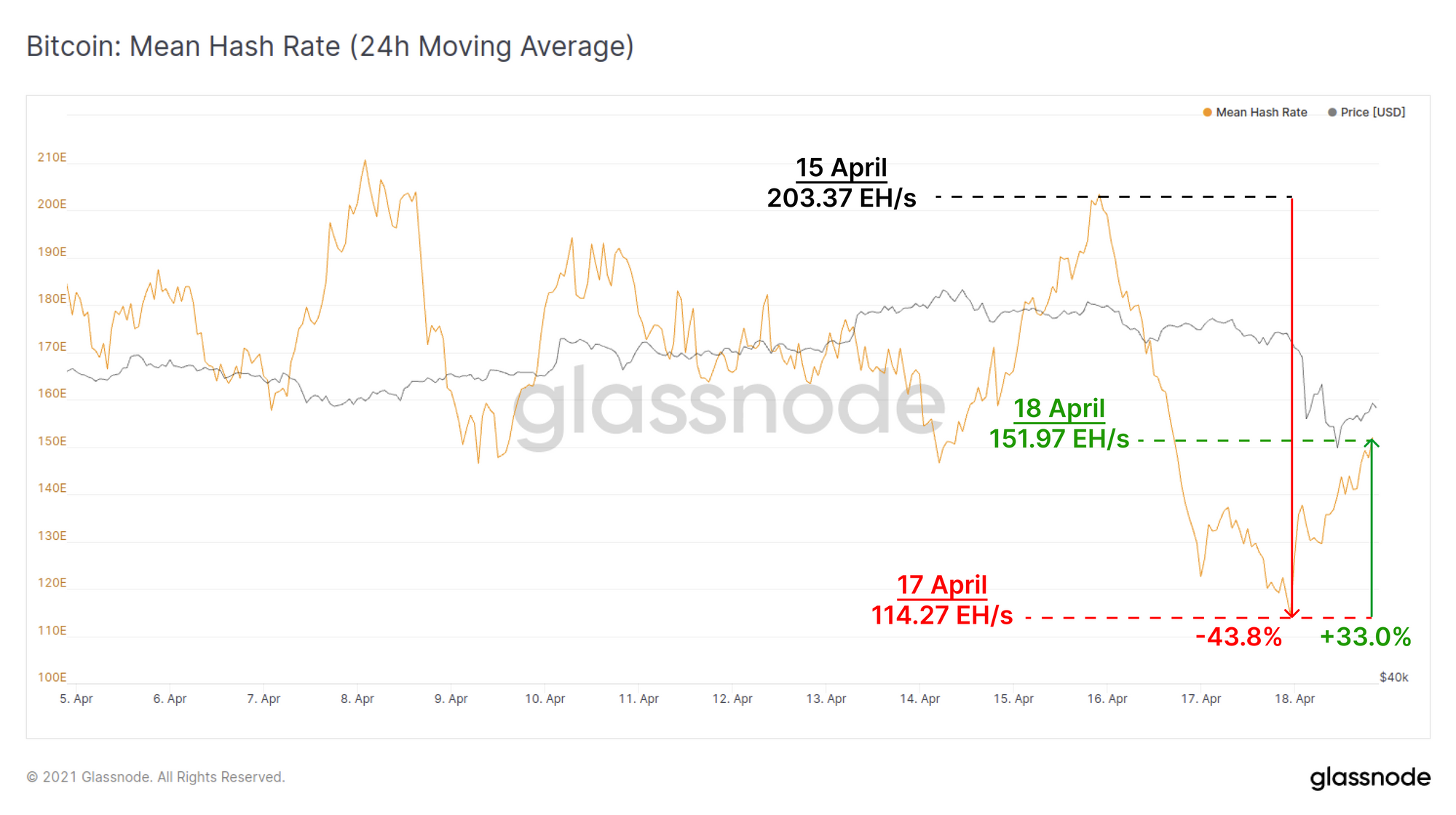 One of the primary narratives circulating around Sunday's sell-off was a spooking of the market due to a precipitous drop in mining hash-rate (although the timing of Sunday's sell off is later than changes in hash-rate and thus is unlikely the primary driver). The hash-rate decline, started late on 15 April and is understood to be due to power outages and a coal mine accident in Xinjiang China, a major centre for the Bitcoin mining industry.