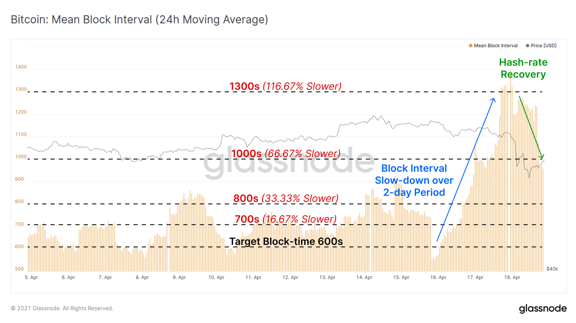 Mean block-intervals, which protocol difficulty targets to 600 seconds, began rising late on 15th, before peaking at over 1,300 seconds (21.6 mins) two days later. Hash-power has since started to recover with average block-intervals speeding back up to an average of 1,000 seconds (16.67 mins).