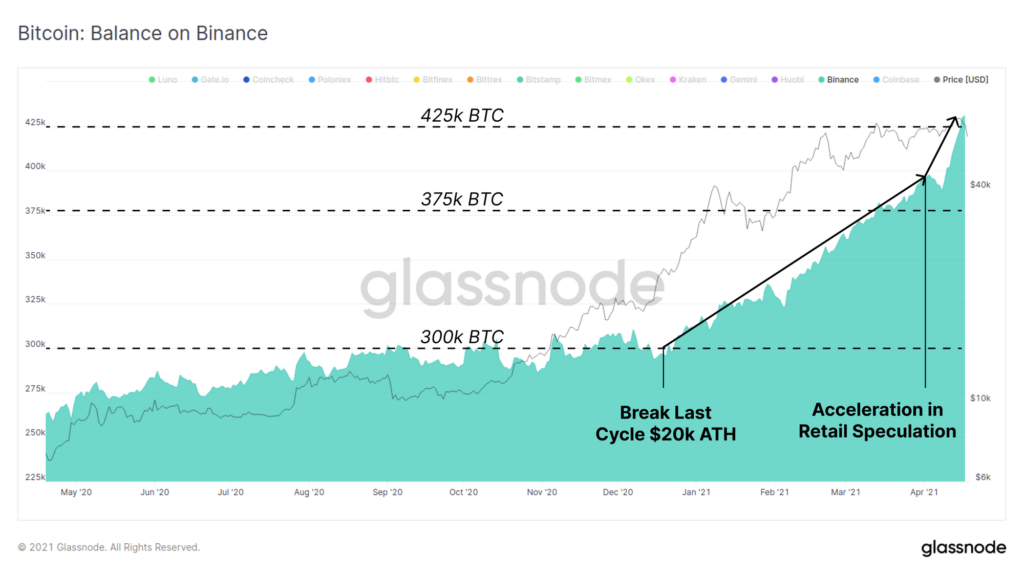The BTC balance held on Binance balance has been in a steady increase since price broke above $20k, but has accelerated in the last two weeks, suggesting increased retail speculation.