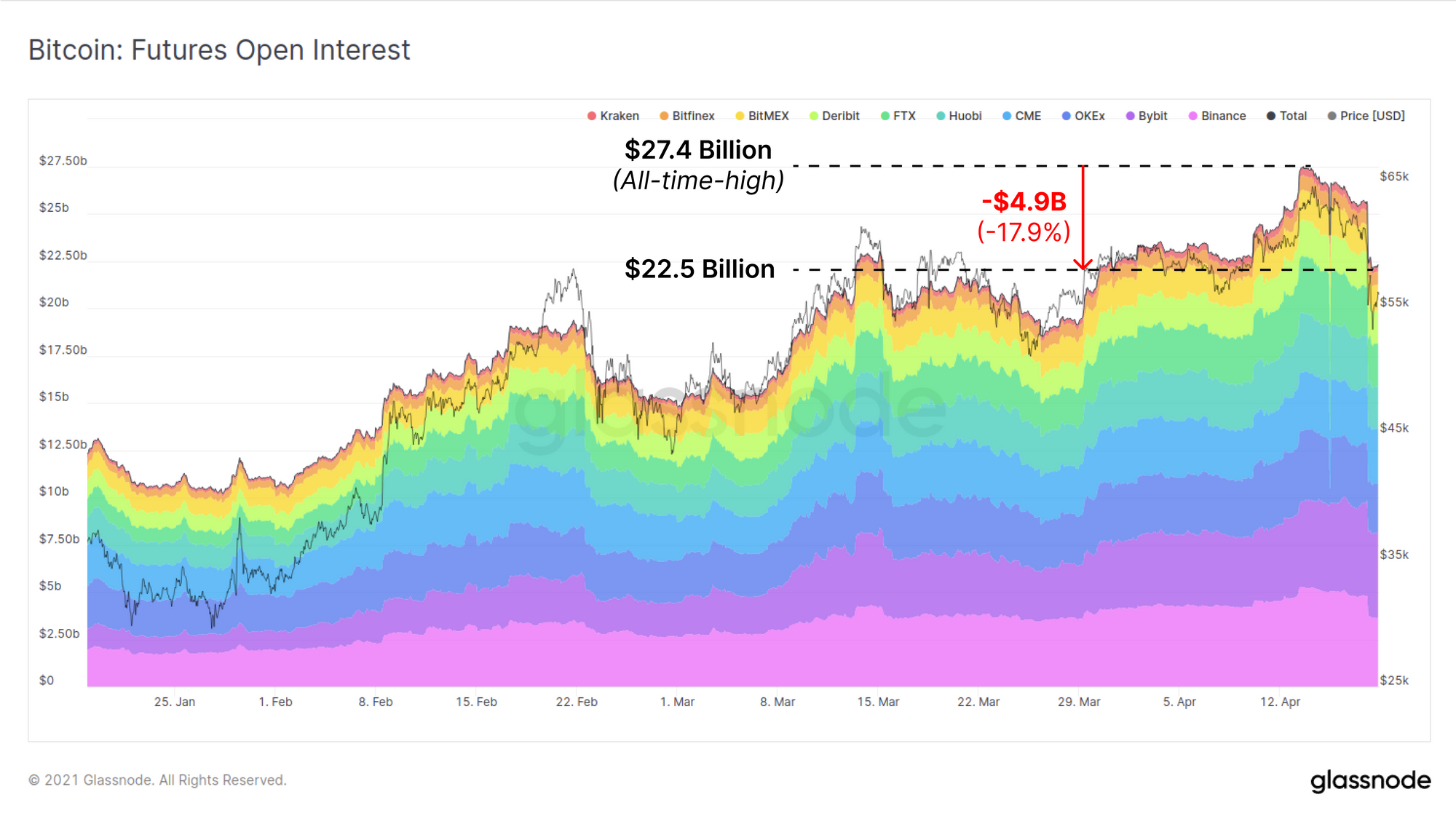Open Interest across derivatives exchanges reached a new all-time-high of $27.4 Billion as price rallied to new highs. However, by Sunday afternoon, a total of $4.9 Billion in futures contracts had been closed out, with the majority of them occurring during the Sunday sell-off.