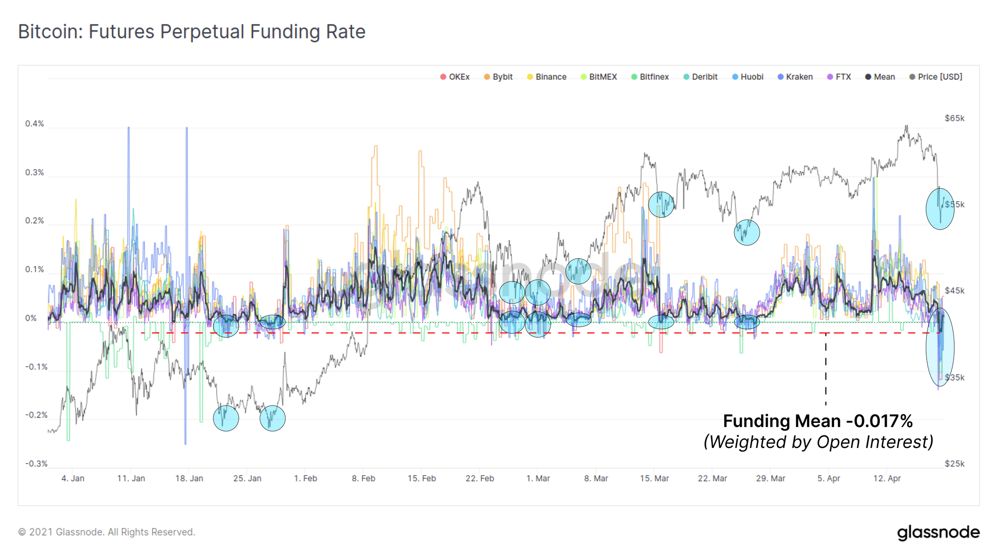 As is customary in the Bitcoin market, excessive leverage is flushed out during rapid price moves, and this week was no exception. As many traders increased their leverage exposure, likely in anticipation of the Coinbase direct listing, the risk of a long squeeze and cascading liquidations had built up in the system.