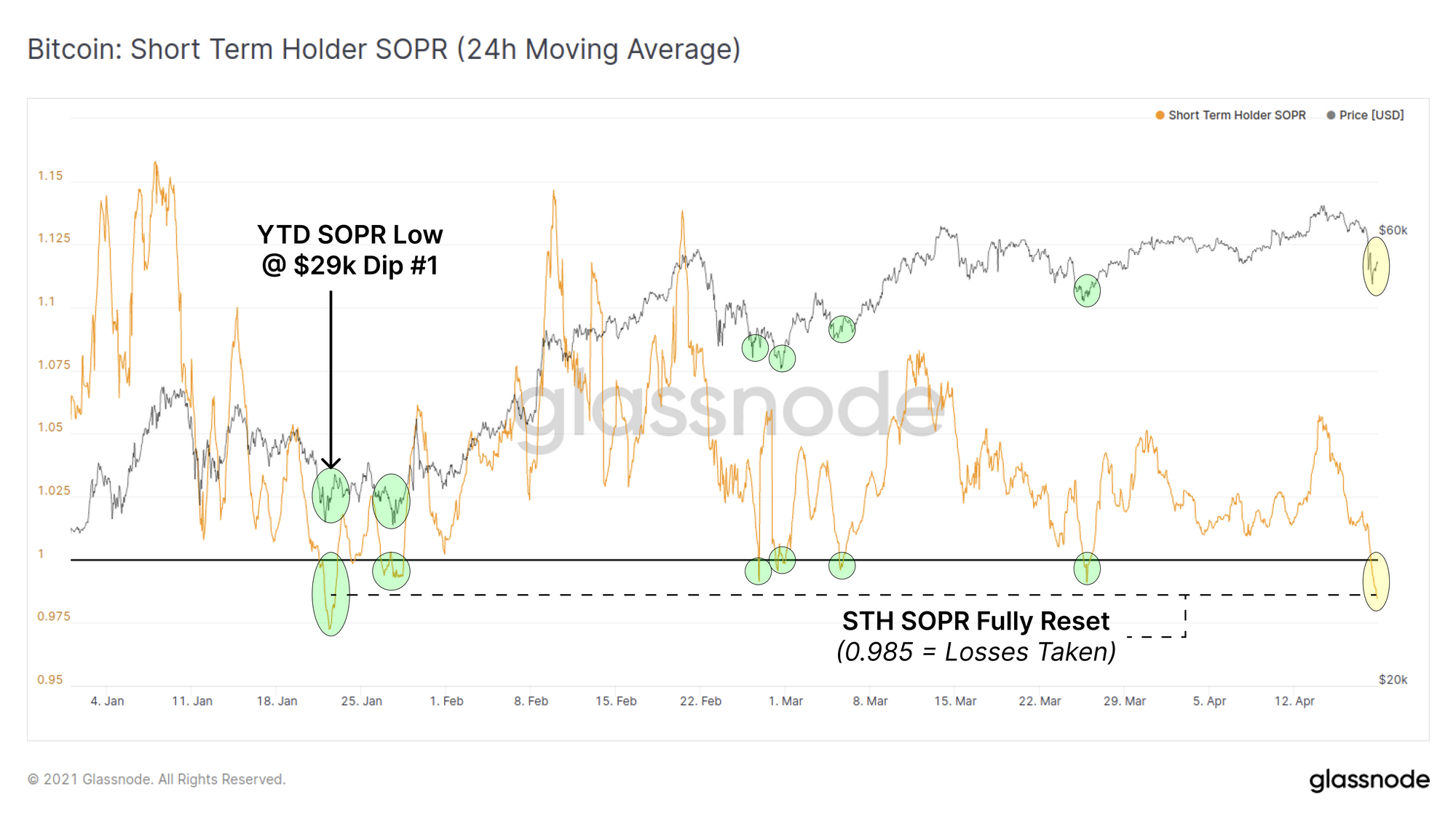 As the STH-SOPR has reset to a value below 1.0, it suggests that some of these new coin holders were shaken out at a loss during this dip. However a low SOPR also signals that new holders who are in profit were not shaken out, indicating relative market strength.