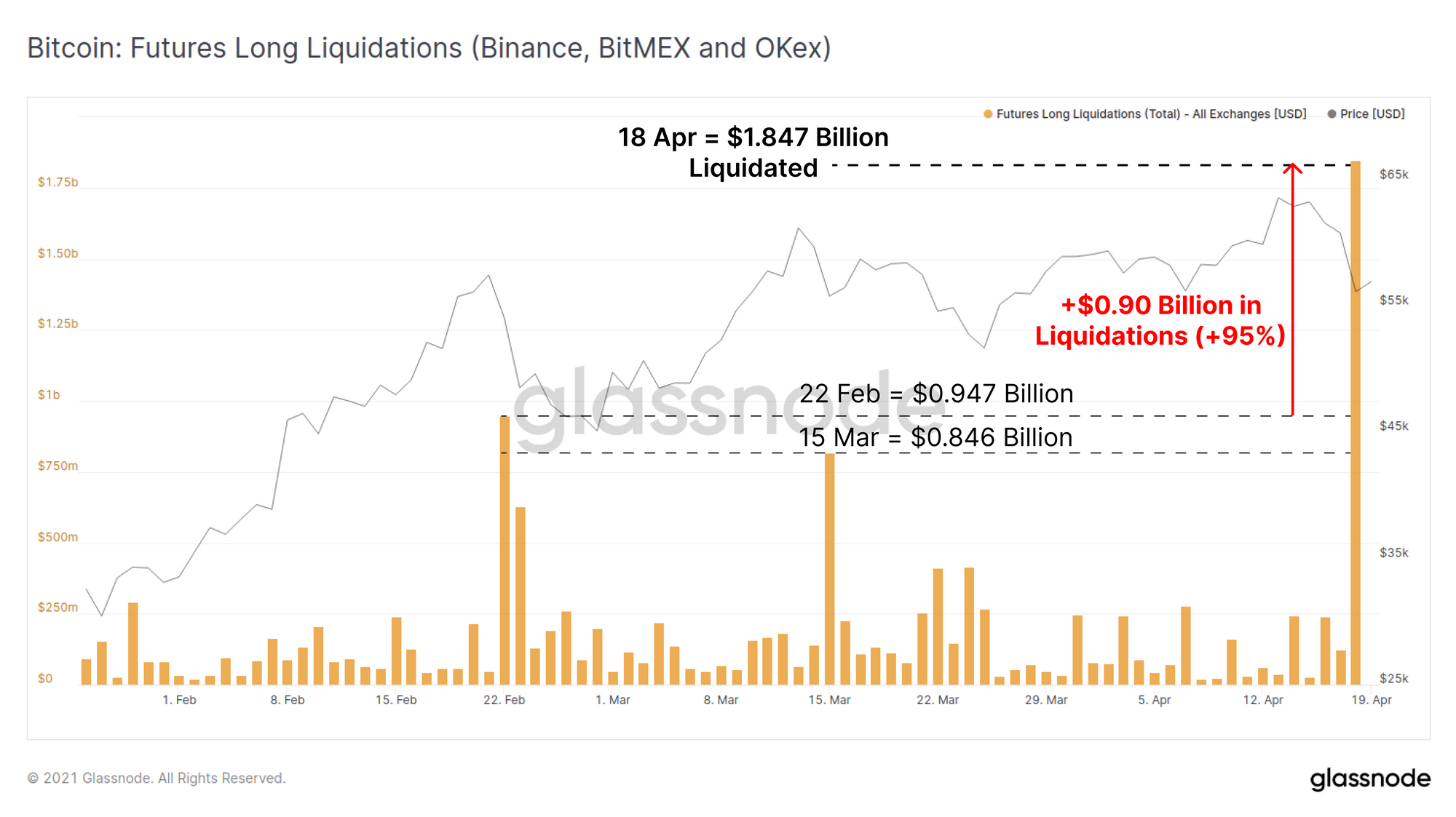 Long Liquidations across Binance, BitMEX and OKex peaked at $1.847 Billion, almost twice (+95%) the previous liquidation high set on 22 Feb. What is notable is how quickly Bitcoin market derivatives clear excessive leverage, with this entire liquidation event settling and clearing within a one hour window.