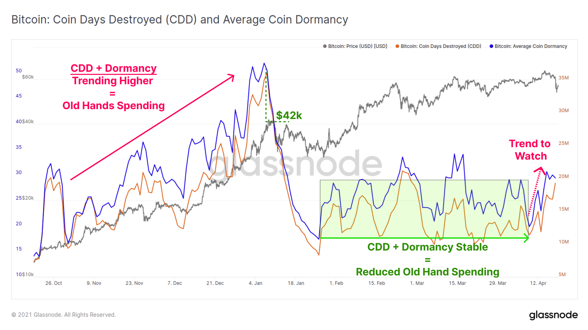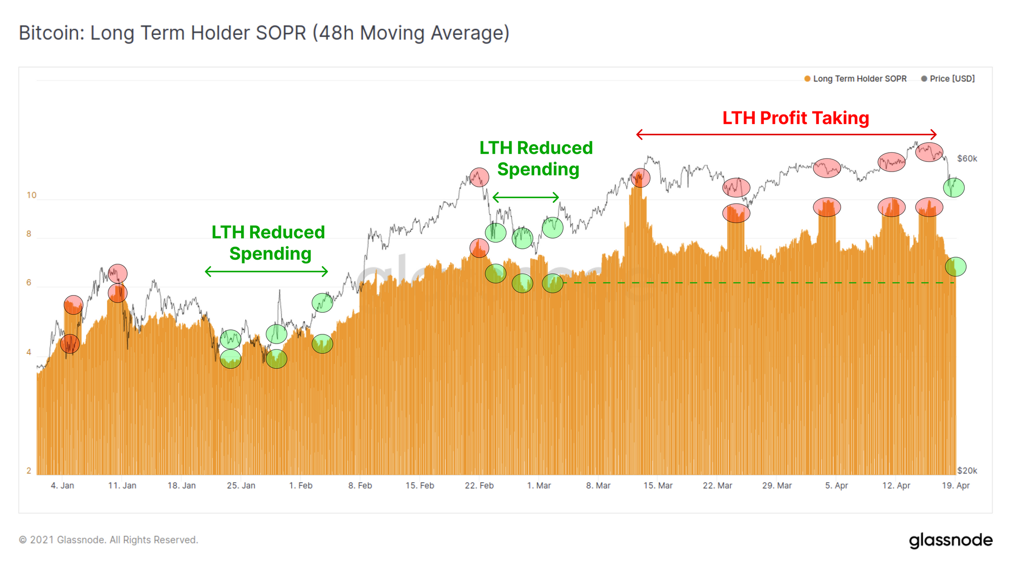 The LTH-SOPR metric tells a similar story and shows that old coins have been realising profits during the consolidation throughout March and April. Intermittent spikes in LTH-SOPR indicate profits were realised by long term holders which can increase the liquid supply, as dormant coins are re-activated in to circulation.
