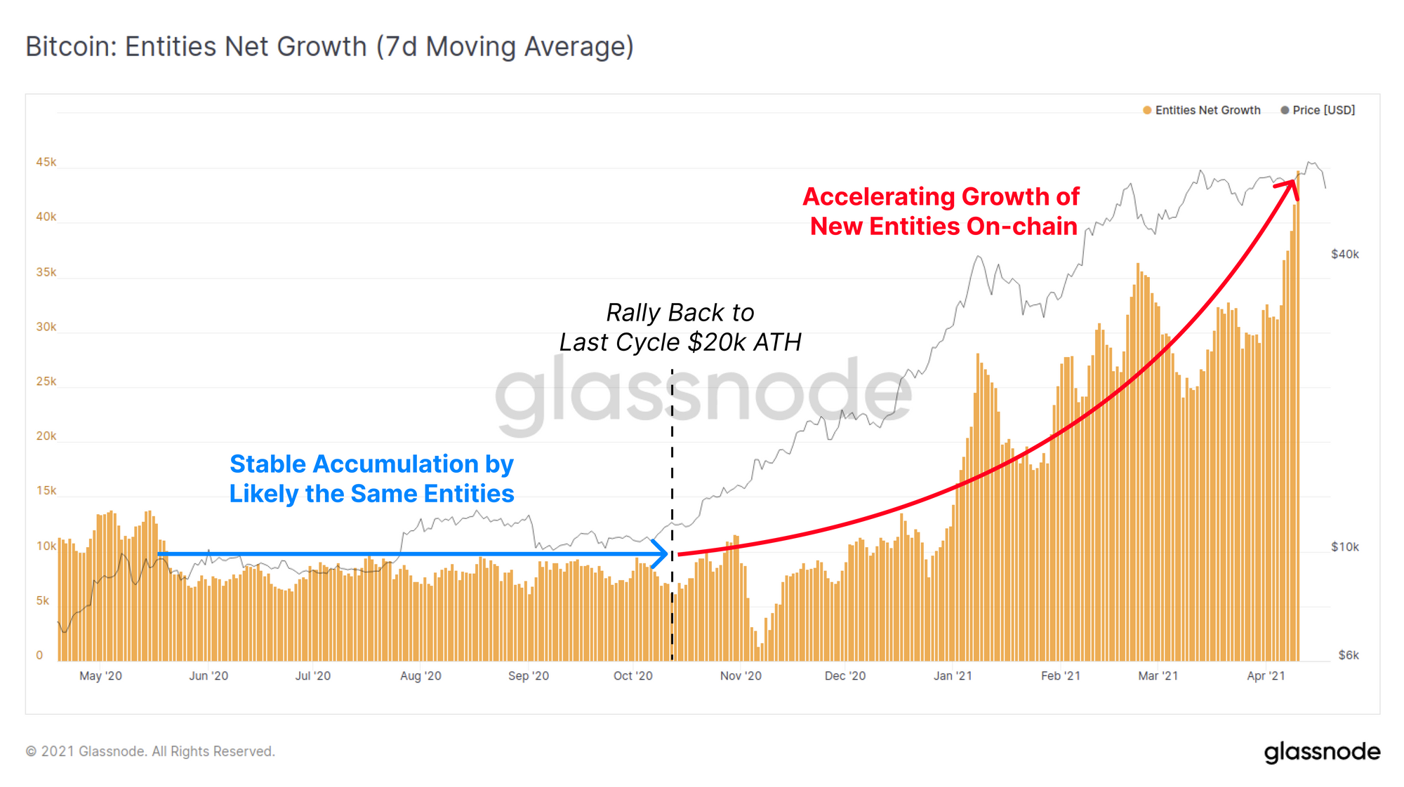Prior to November 2020 (before the rally back to last cycles $20k ATH), net entity growth was relatively stable, most likely describing regular 'sat stackers' and accumulators. Since then, we have seen a parabolic increase in new entrants appearing on-chain, with new highs set early this week.