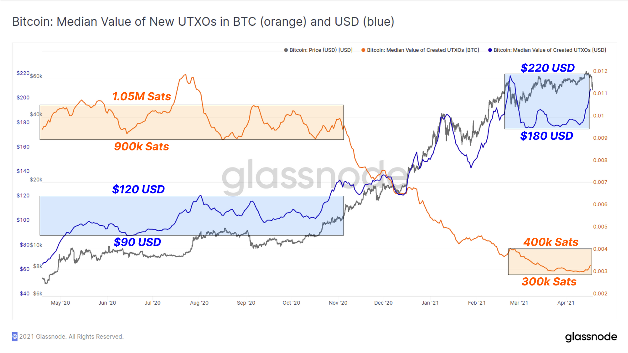 As both price and net entity growth expanded upwards, the median UTXO value has decreased to 300k to 400k sats (3x fewer sats) but has increased in fiat value to between $180 and $220 (2x more dollars). This demonstrates an approximate increase in BTC purchasing power of ~600% whilst the 'typical investment value' has doubled in fiat terms relative to late 2020.