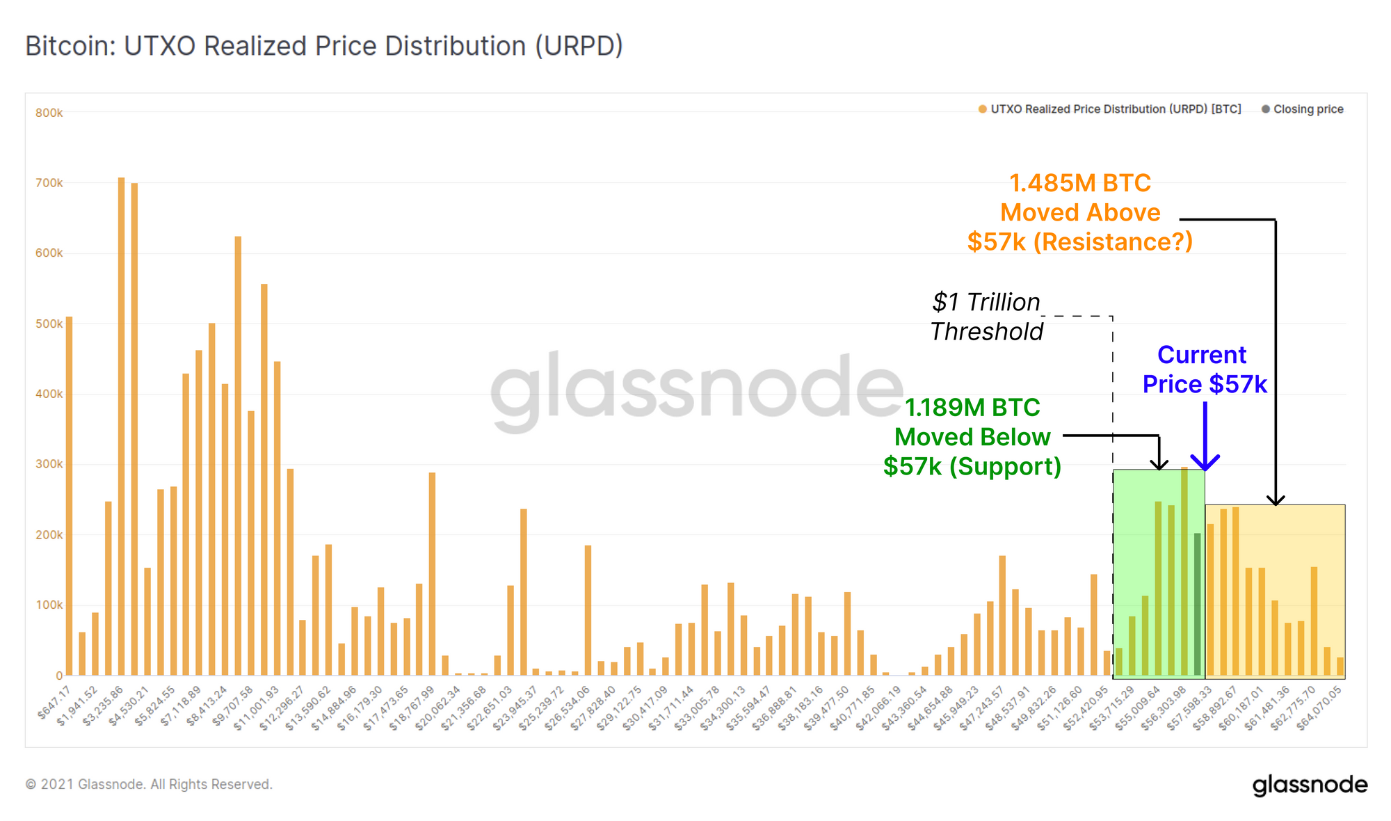 Previous editions of this newsletter discussed how this on-chain volume cluster is likely to provide strong support and help justify the $1 Trillion valuation (so far, this is the case). In this Trillion dollar support zone, 1.189M BTC has moved above $53.5k but below the current price of $57.0k (equivalent to 6.37% of circulating supply).