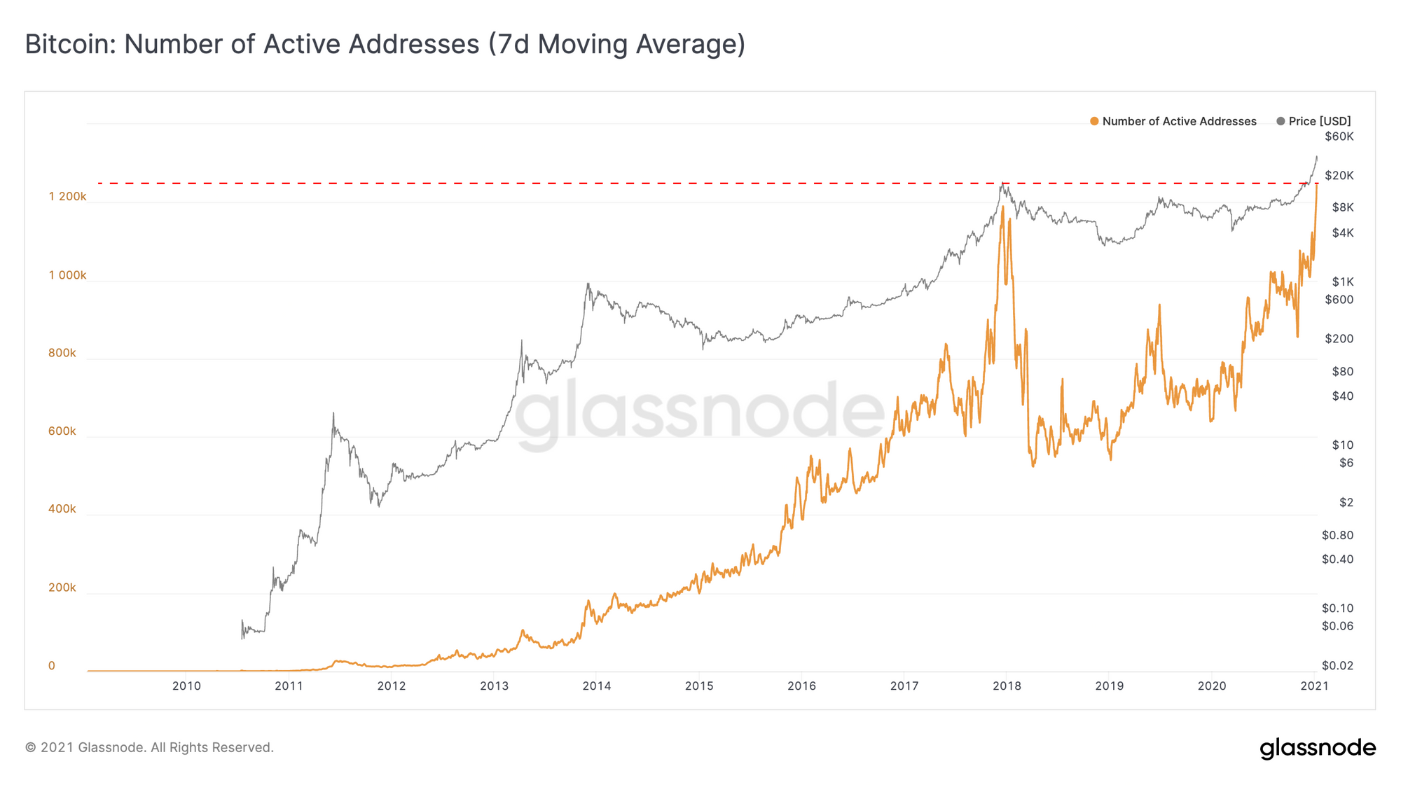 As BTC continues to rise in price, its adoption and usage are also growing, with the number of active addresses reaching a new all-time high for the first time since the late 2017 bull market top.