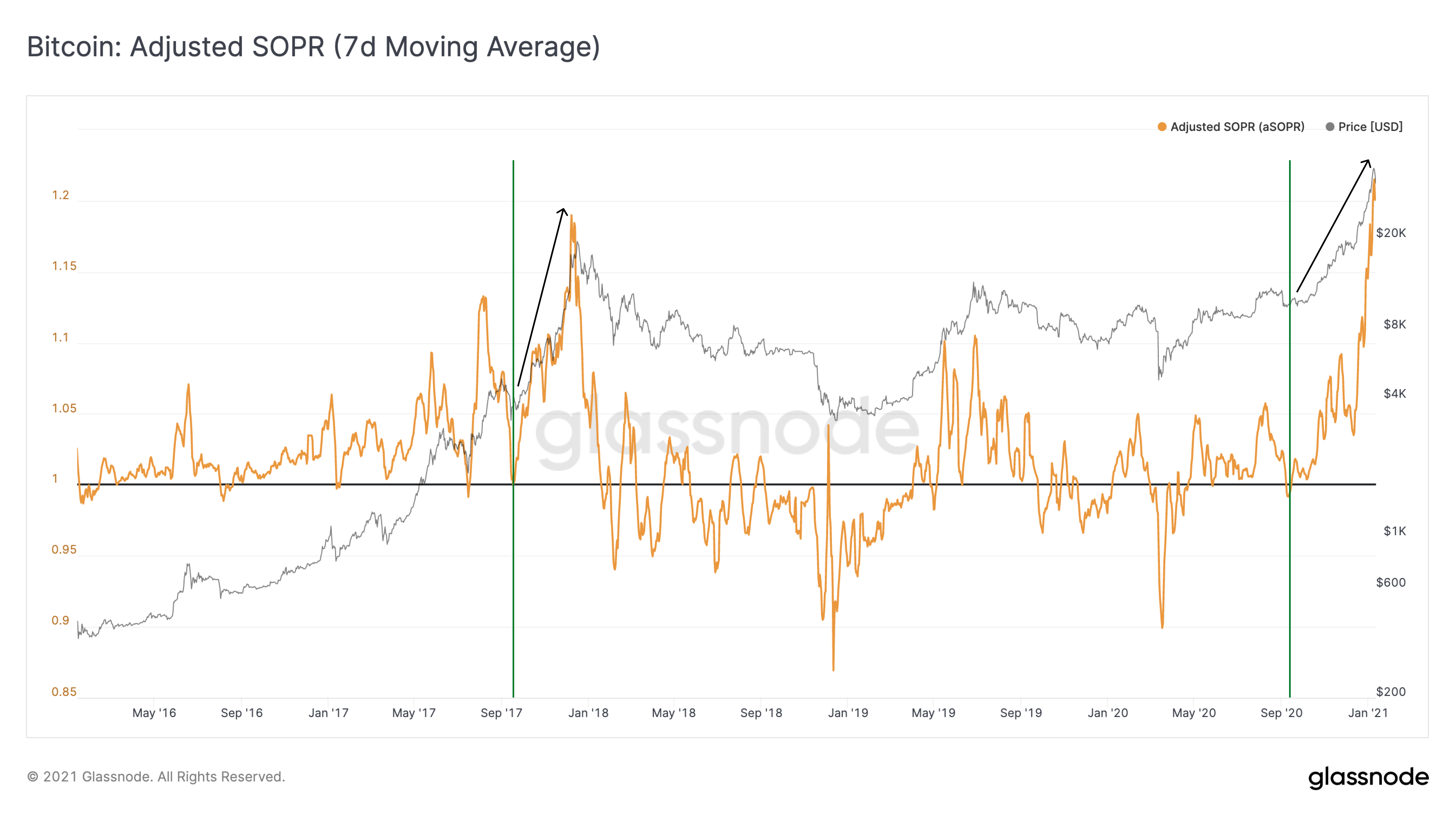 Bitcoin's aSOPR (Adjusted SOPR) is extremely high, and hasn't reset back to zero in over 3 months, as it periodically does on the way up. In 2017, aSOPR surged without resetting for 3 months as well – until BTC reached the top.