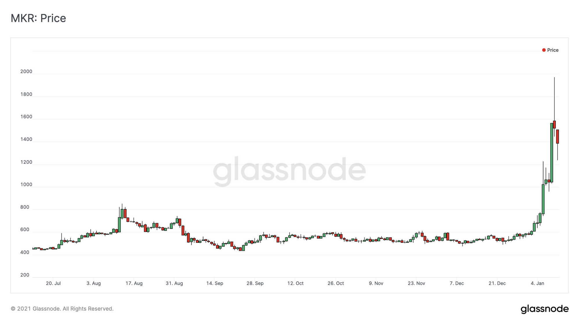 After languishing behind the rest of the DeFi token market and failing to maker significant price gains for the past year, MKR (the native governance token of MakerDAO) suddenly shot up last week from below $600 to an all-time high of $1973.29, which it reached early on Sunday.