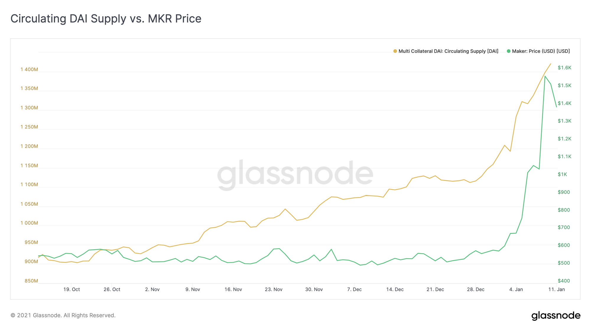 News outlets credited "DeFi growth" for the surge in MKR's price, but that doesn't explain why this relatively stable token has suddenly bucked its previous trend to catch up with the rest of the DeFi market. Rather, the increase in the token's price can more likely be attributed to a massive increase in demand for DAI, the stablecoin generated by the MakerDAO protocol.