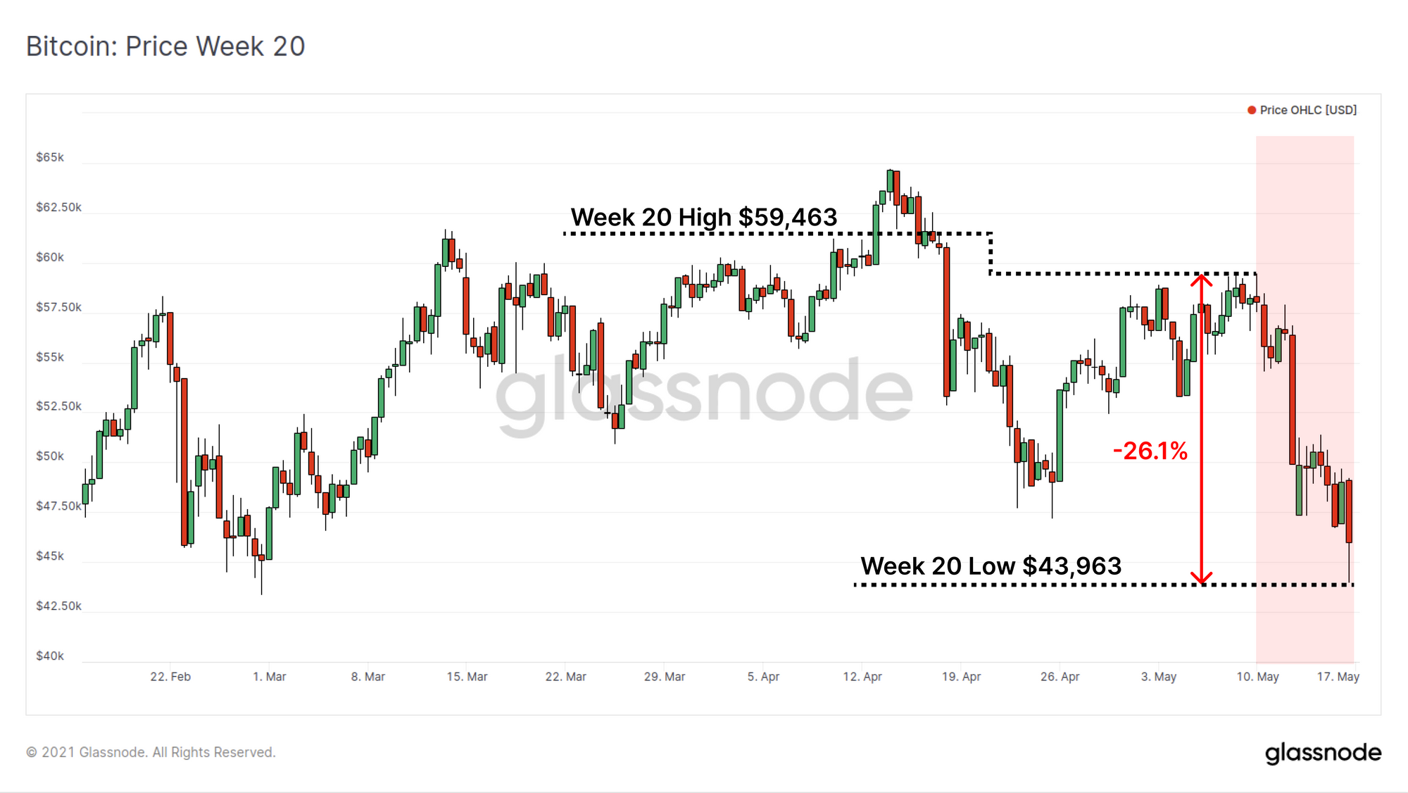 Bitcoin price has traded down over 26.1% this week as the market reacts to a series of tweets released by Elon Musk expressing concerns over the power consumption of Proof-of-Work mining. The market opened the week at high of $59,463 before trading down to $43,963 as the twitter saga unfolded.