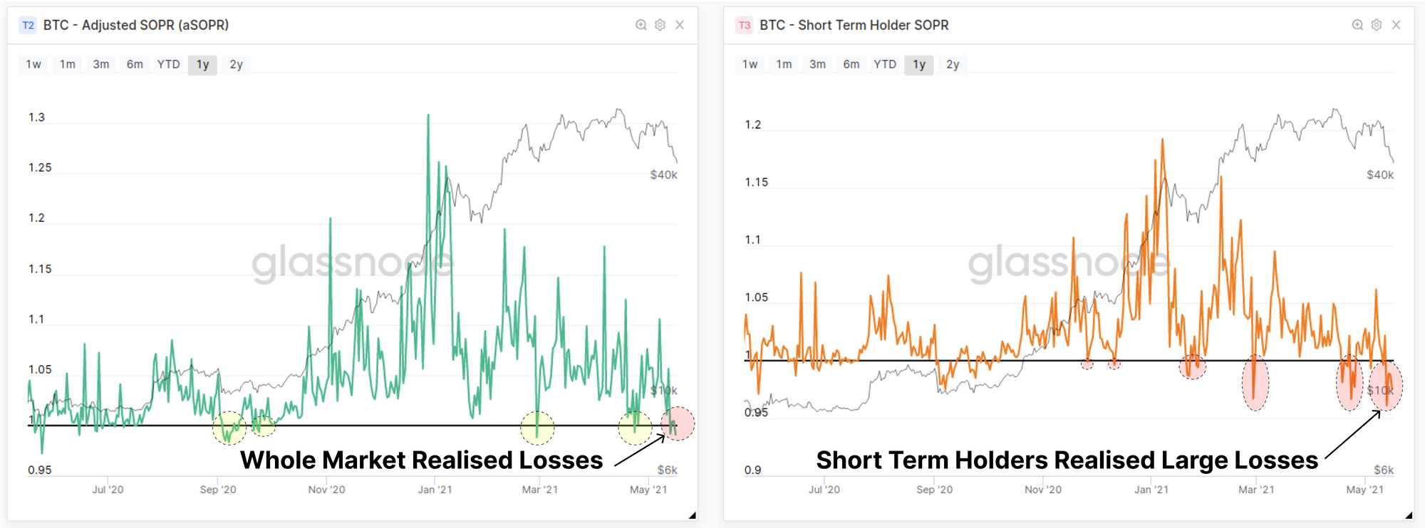 Newer market entrants have panic sold and realised significant loses on their coins, with both the aSOPR and STH-SOPR dipping below 1.0 once again. Both of these metrics consider the degree of profit realised by coins moving on-chain, with higher values indicating profitable coins were on the move, and values below 1.0 indicating most coins were last moved at higher prices.