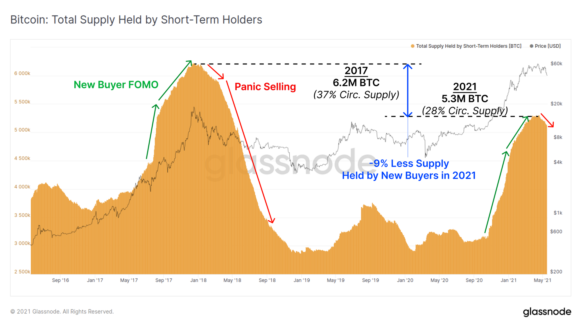On-chain we can observe a notable bifurcation of reactions, with newer market entrants panic selling and realising losses, whilst long term hodlers appear relatively un-phased by the news. There are many supply and demand dynamics that resemble the 2017 macro top however with unique differences that will challenge the conviction of both bulls and bears.
