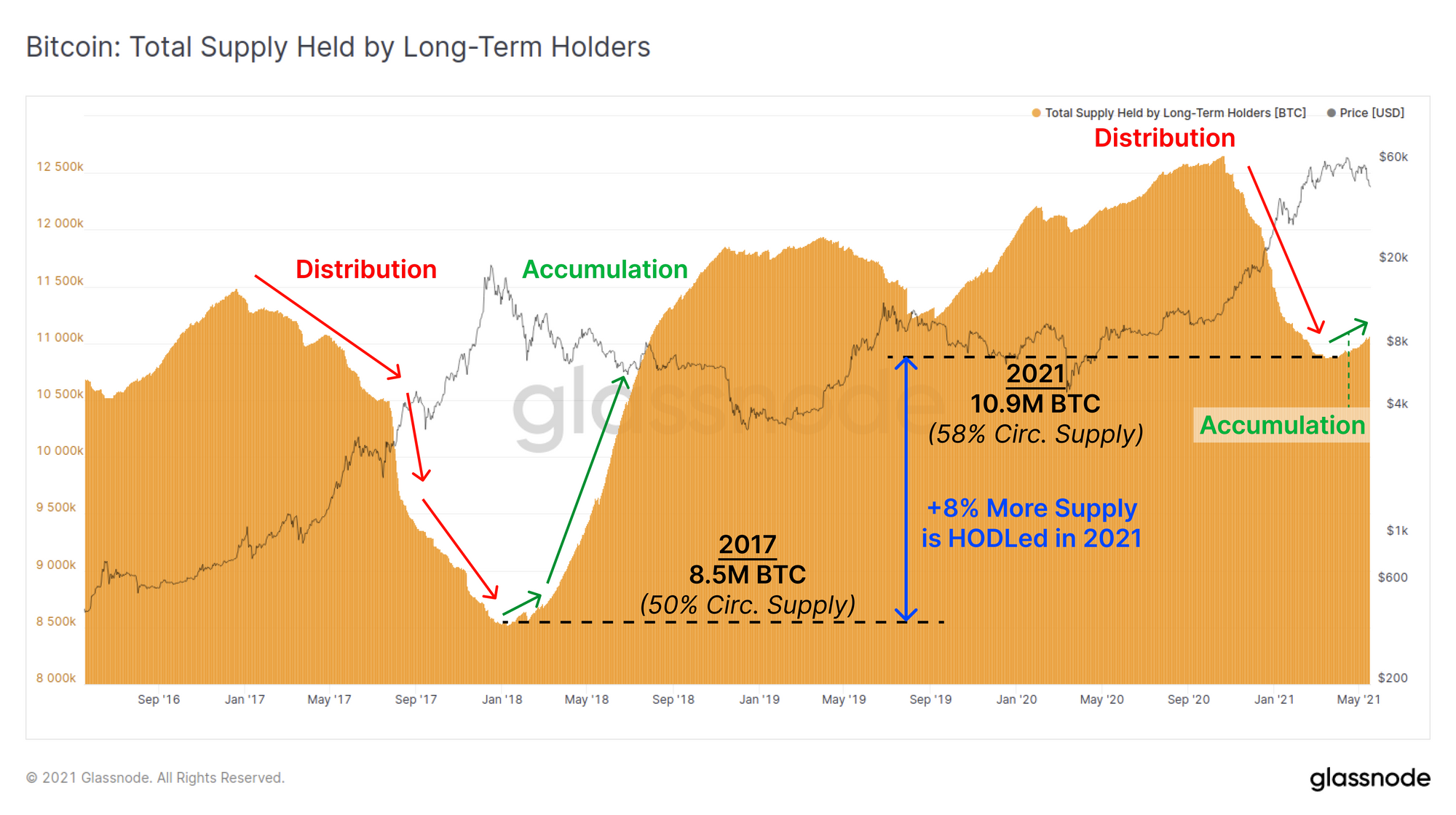 The current LTH owned supply is over 2.4M BTC (8% a proportion of circ. supply) more than it was at the 2017 peak. This indicates that a large volume of coins have moved to and remain in illiquid cold storage and this trend is continuing.