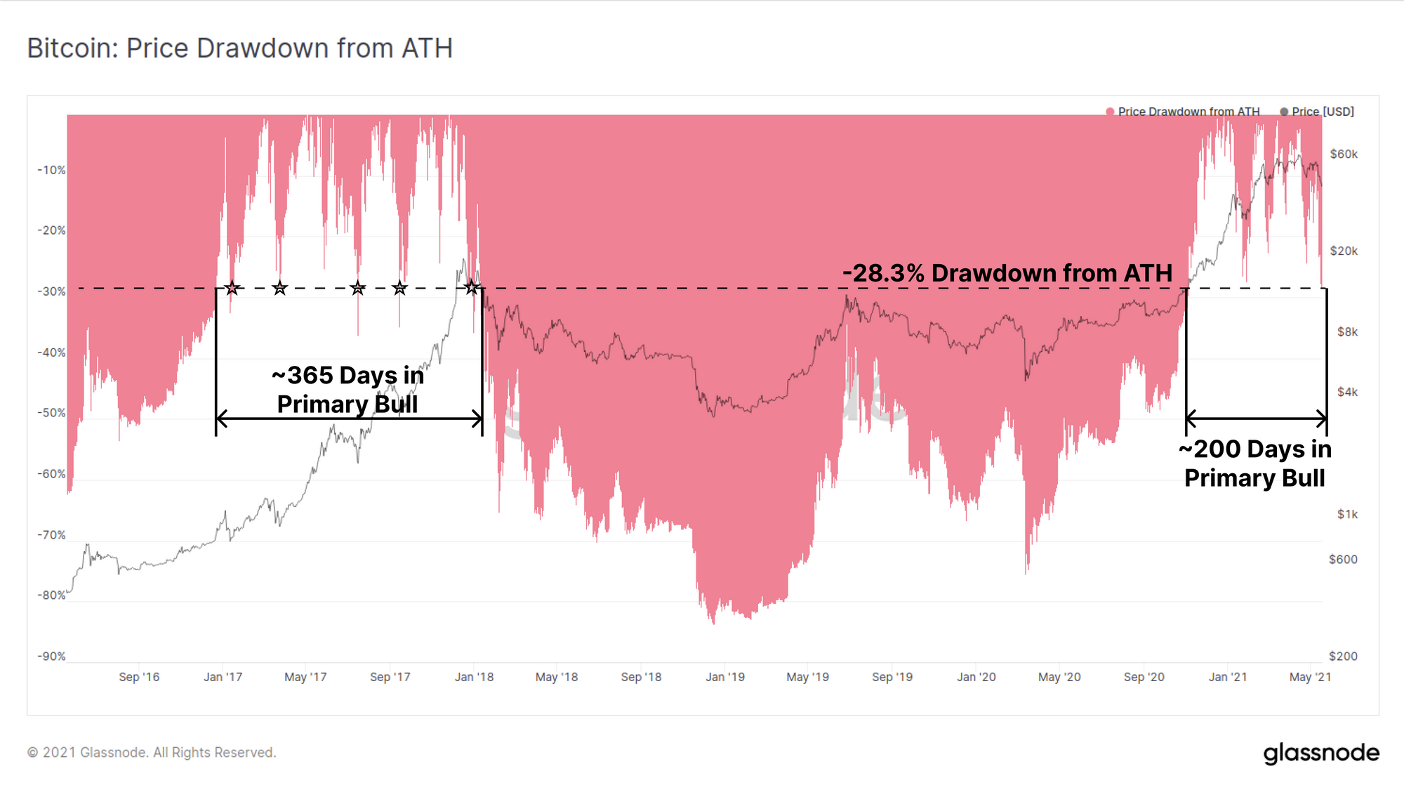 In terms of bull market duration, the 2021 primary bull (where new ATHs are set frequently) has run for around 200-days, which is relatively short compared to the year long bull run in 2017.