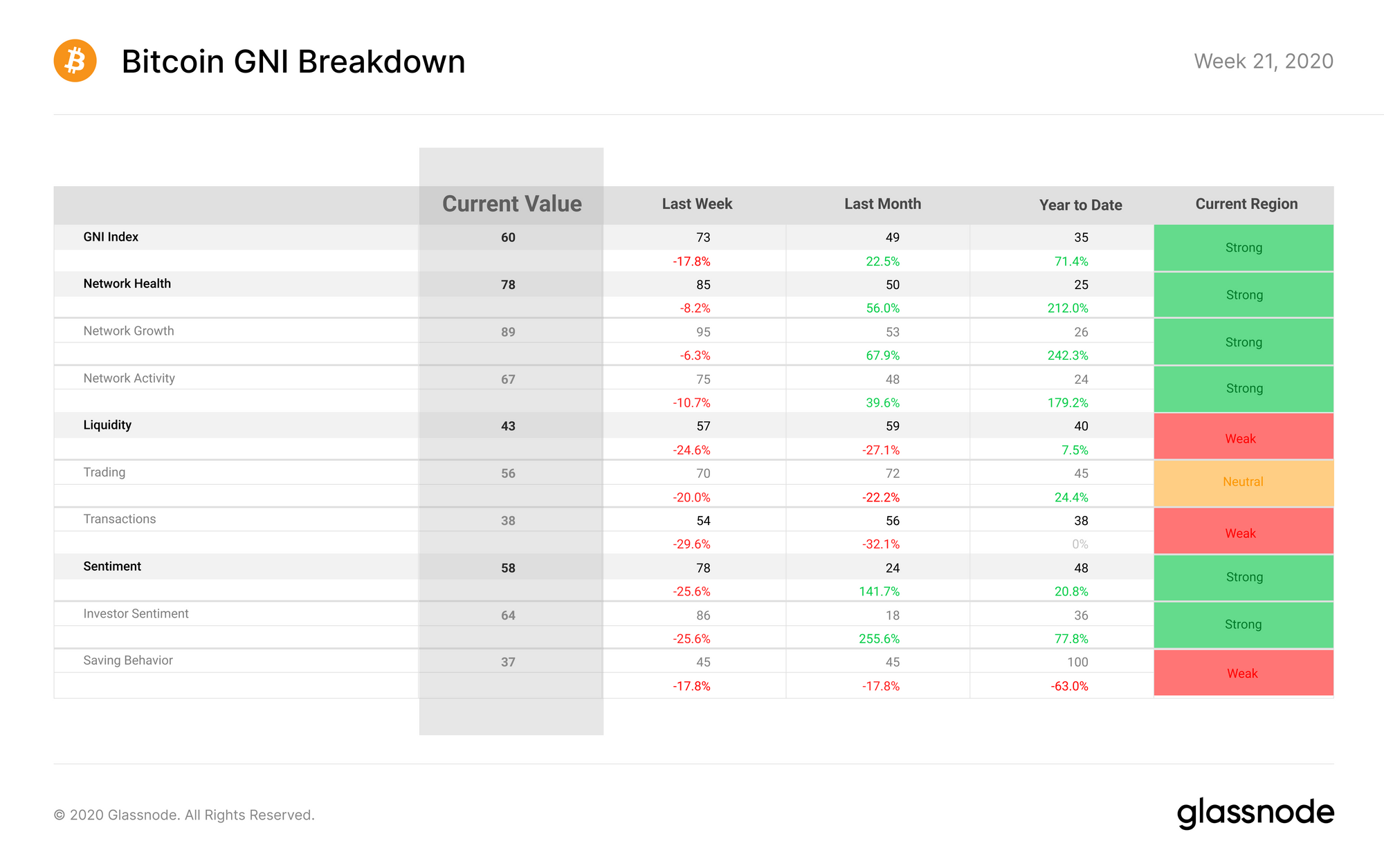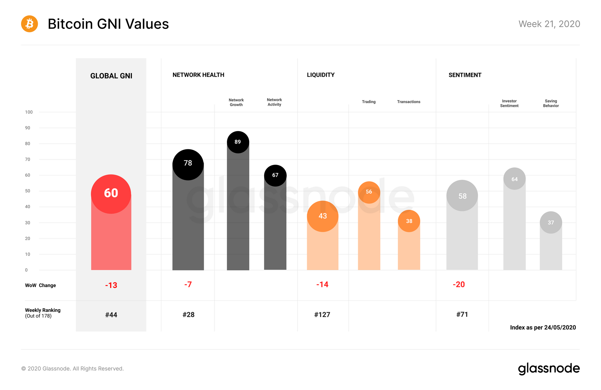 Bitcoin on-chain fundamentals saw a distinct decline during Week 21. GNI decreased by 13 points, down to a value of 60. This drop - mainly driven by decreases in Sentiment and Liquidity - solidifies the trajectory change seen in Week 20; for the time being, on-chain fundamentals are in decline, alongside Bitcoin's price.